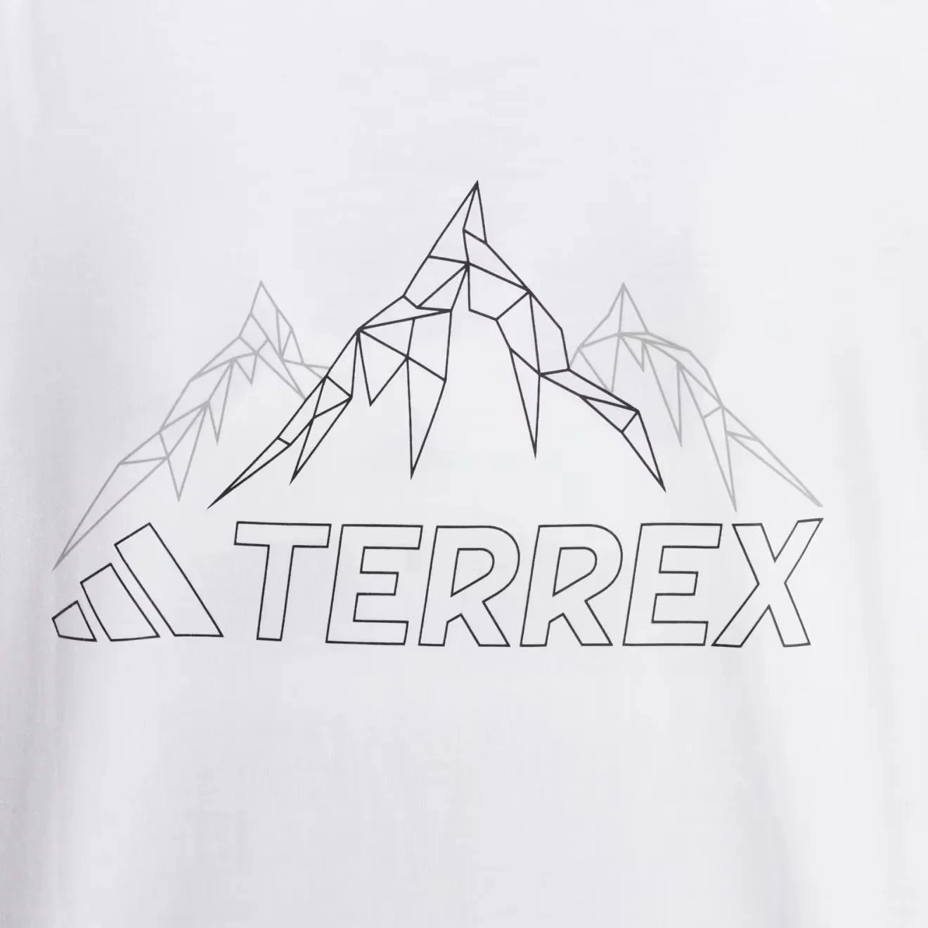 Adidas Terrex Mountain Graphic T-Shirt in White. Pull on this adidas outdoor tee and plot your next adventure. Lightweight single jersey and an easy-wearing fit deliver all-day comfort, and the graphic on the back shows your dedication to the outdoors. The cotton in this product has been sourced through Better Cotton.
