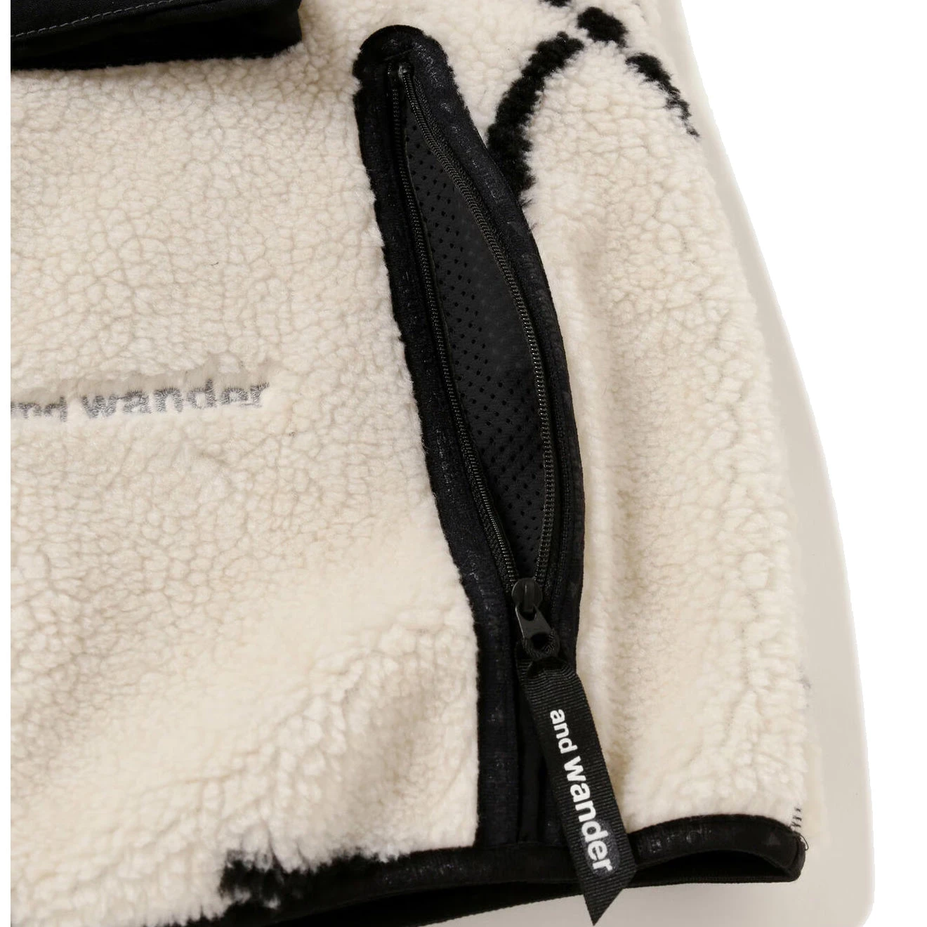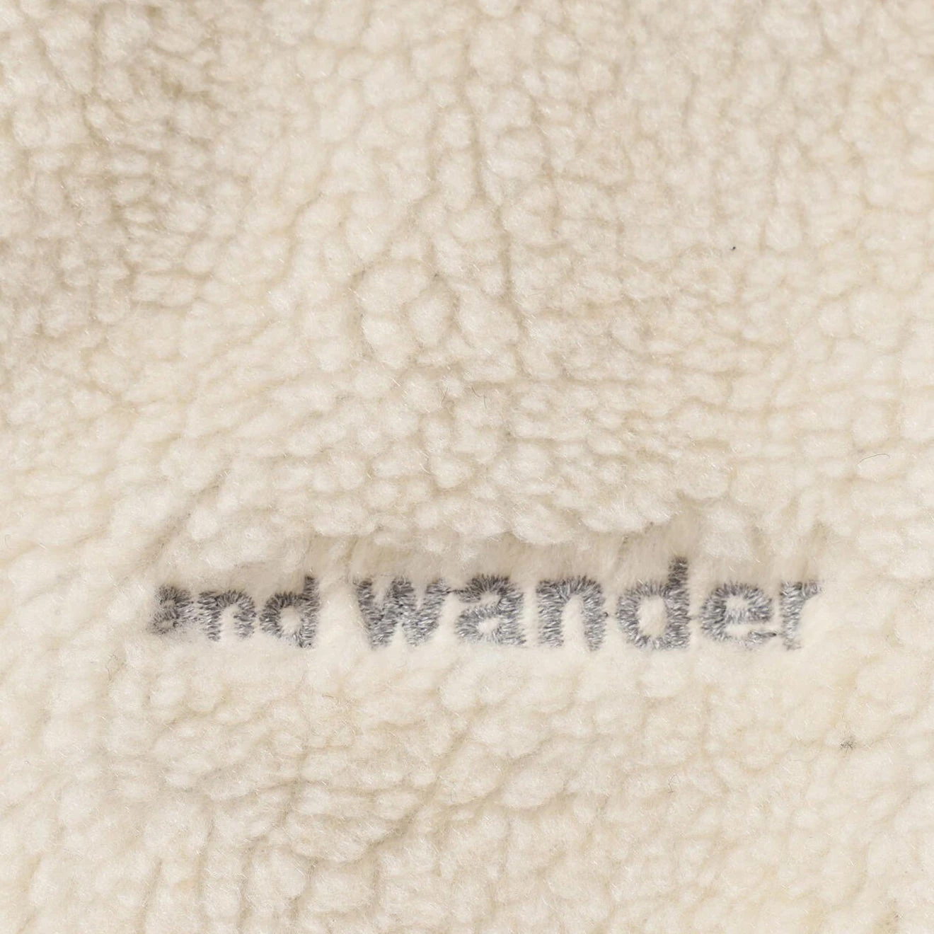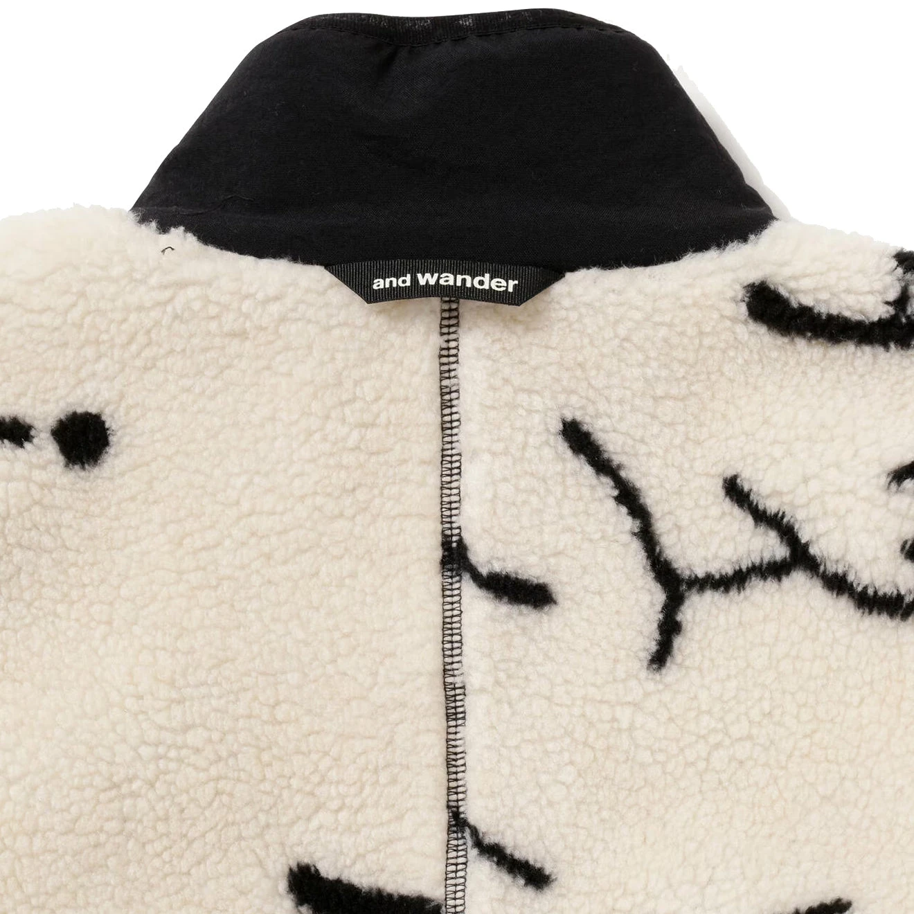 And Wander Daijiro OHARA map key boa jacket in off-white. The boa material is based on a drawing reconstructed from mountain climbing symbols by art director Daijiro Ohara. It is woven with recycled polyester from CALAMAI TECHNICAL FABRICS and bonded with a comfortable cotton jersey. High neck with branded zip front closure, long sleeve, branded tape trims. Chest flap pockets with branded snap summary. Embroidered and Wander logo, side zip pockets, relaxed fit and fully lined.