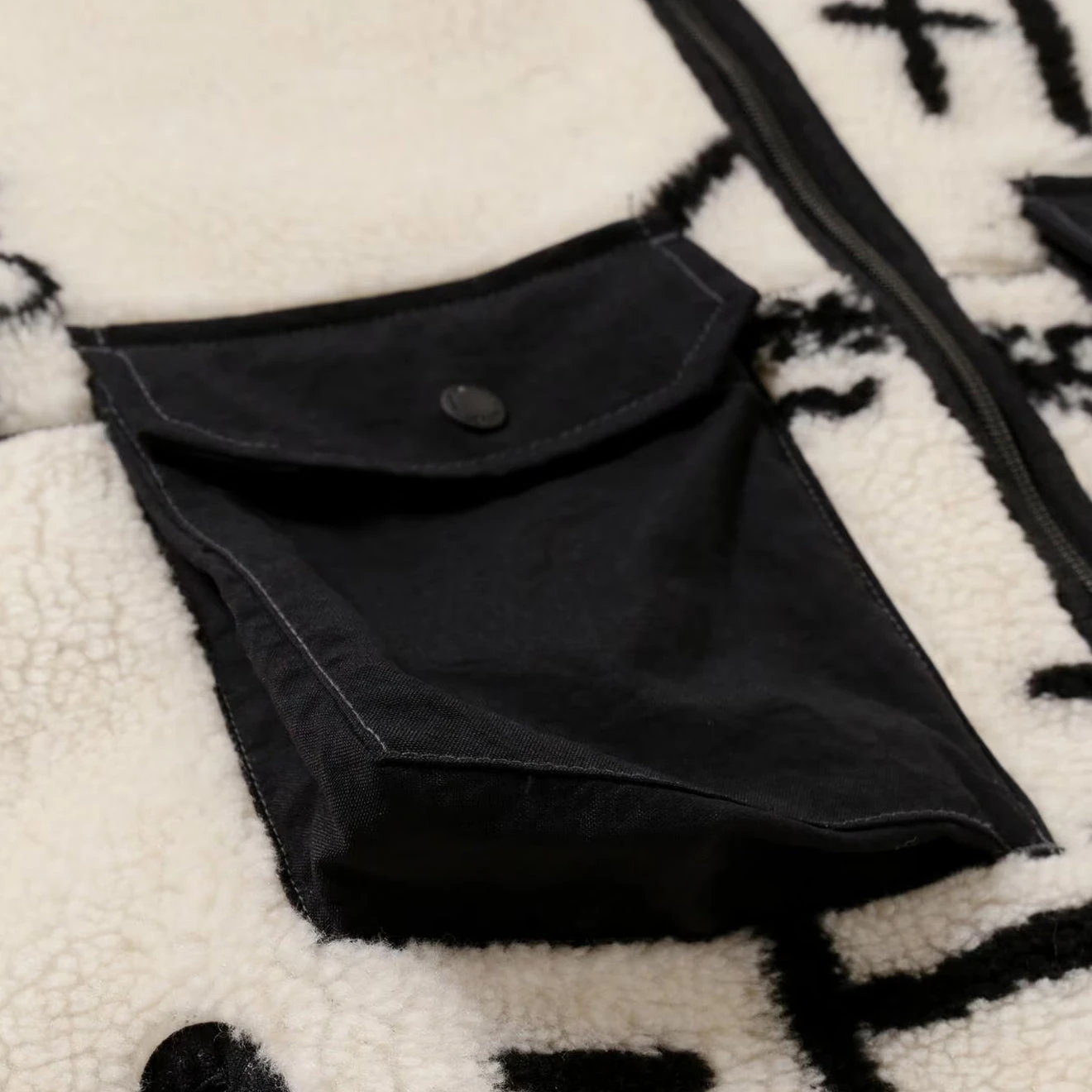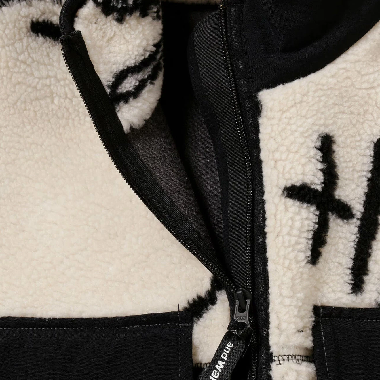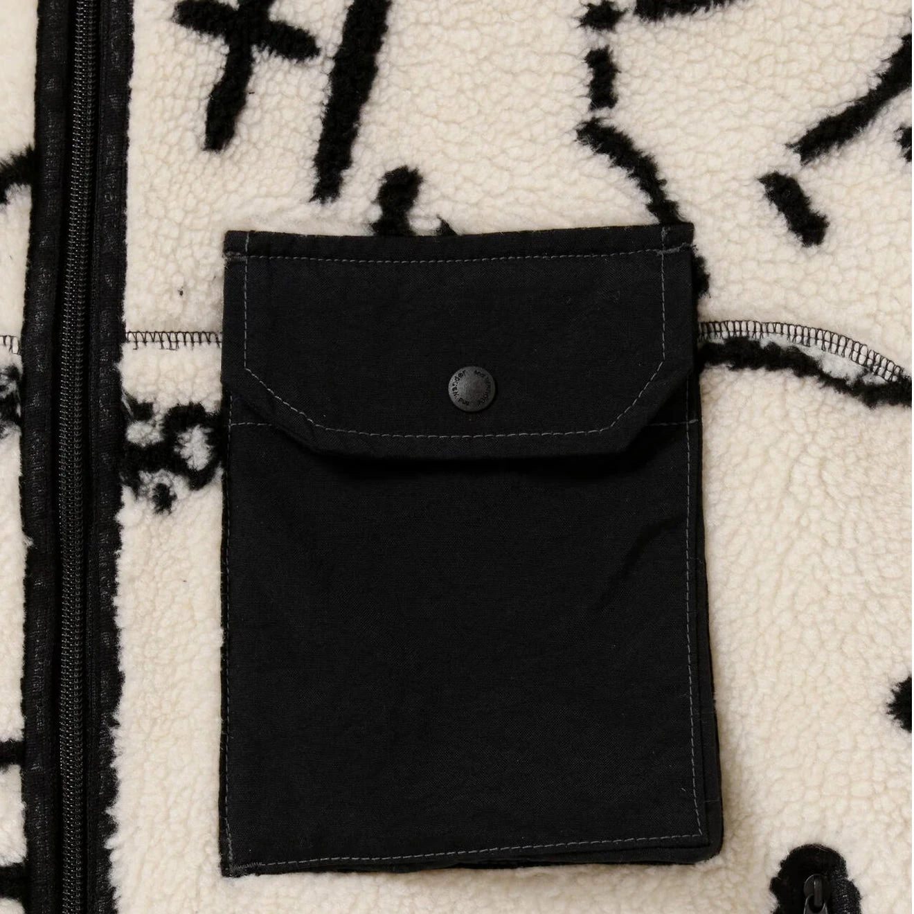 And Wander Daijiro OHARA map key boa jacket in off-white. The boa material is based on a drawing reconstructed from mountain climbing symbols by art director Daijiro Ohara. It is woven with recycled polyester from CALAMAI TECHNICAL FABRICS and bonded with a comfortable cotton jersey. High neck with branded zip front closure, long sleeve, branded tape trims. Chest flap pockets with branded snap summary. Embroidered and Wander logo, side zip pockets, relaxed fit and fully lined.