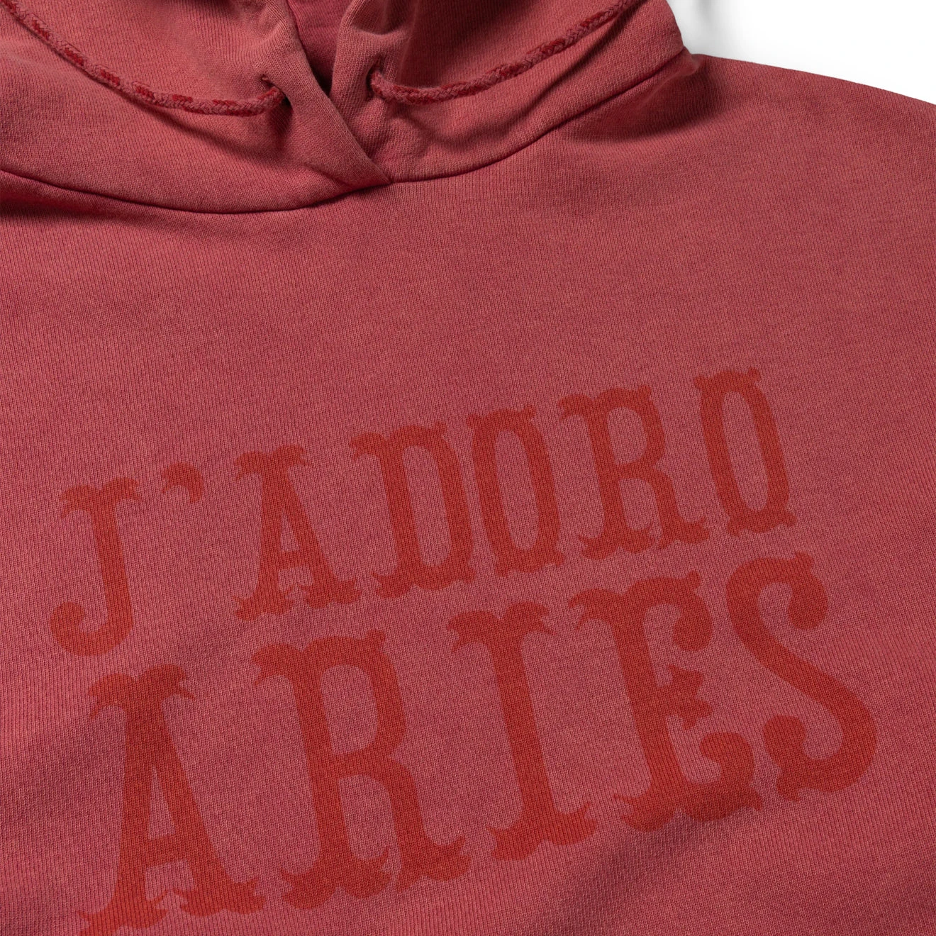 The Aries Aged Premium J’adoro Cowboy Hoodie in Red is a unisex hooded sweatshirt crafted from heavy brushed-back cotton jersey fleece. It features contrast colour ribbing and a bold J’adoro Aries Cowboy graphic screen-printed on the front. Finished with a heavy wash treatment for a vintage, worn-in look, this Italian-made hoodie blends standout design with premium comfort.