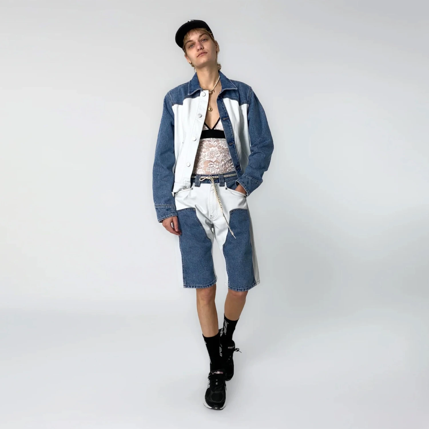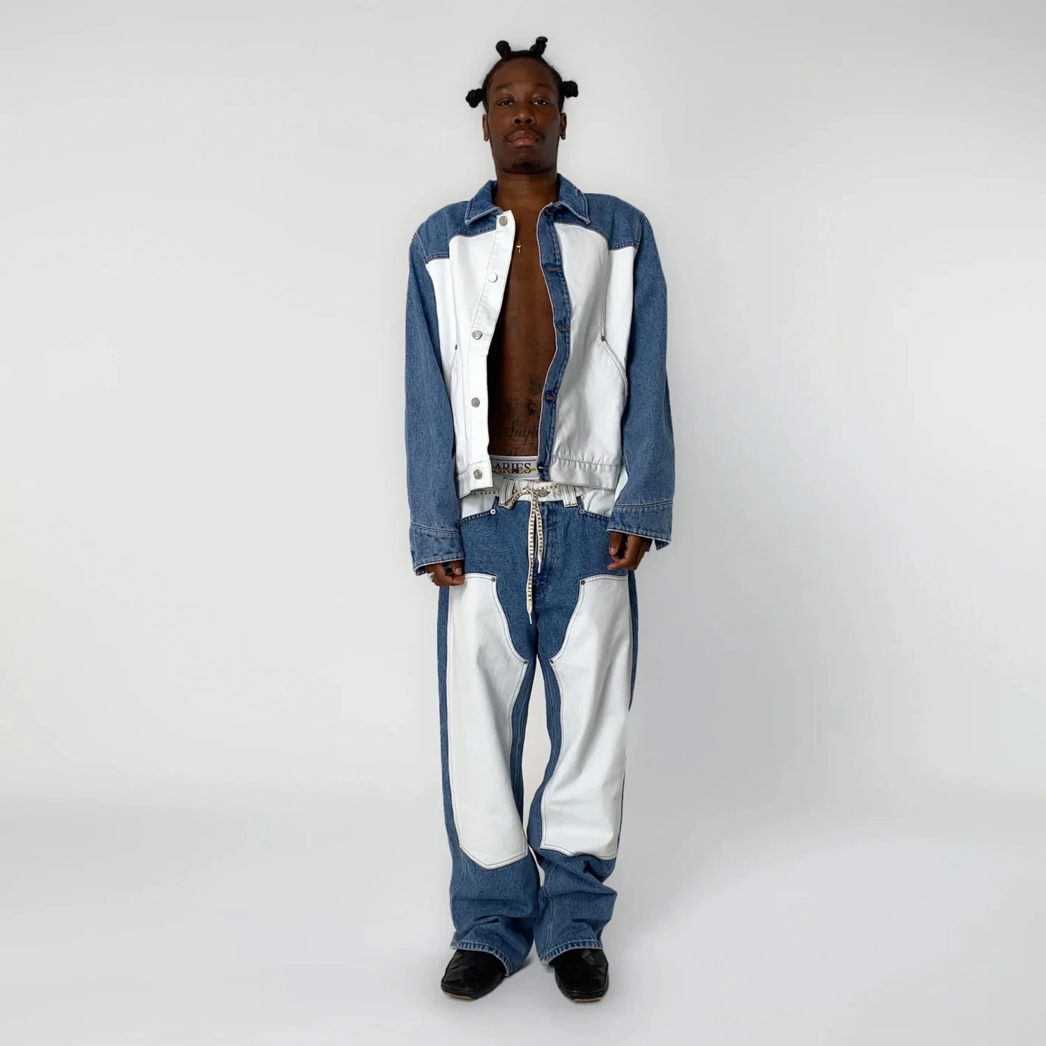 The Aries Patchwork Western Carpenter Jacket in Blue and White is a unisex workwear-inspired piece crafted from indigo and white denim. Featuring a contrast Western yoke and sleeves, it’s detailed with custom Aries jeans summarys and seam-integrated lower pockets. Finished with a light stone wash for a soft, worn-in feel, this jacket blends utility and standout style with a modern Western twist.