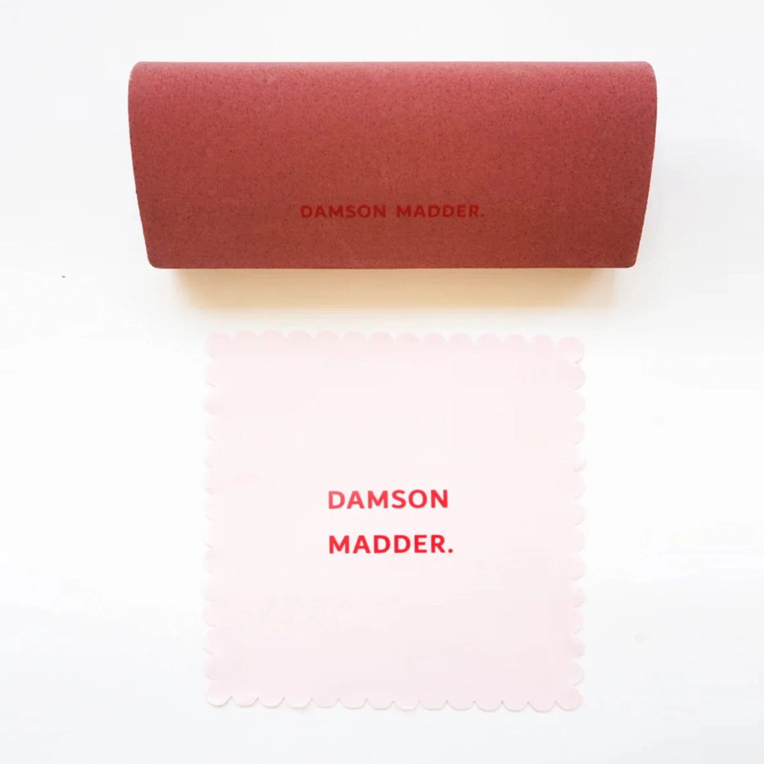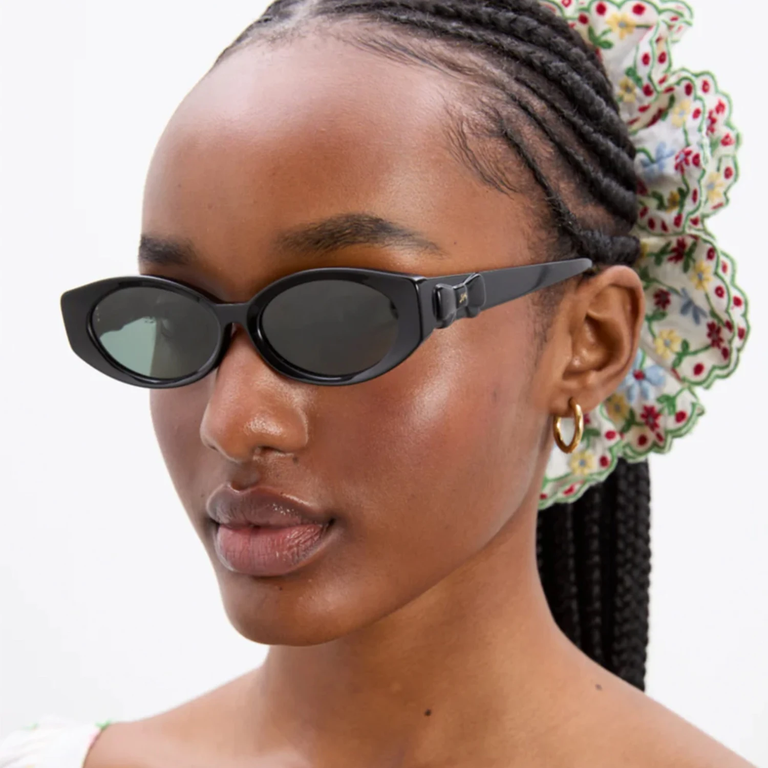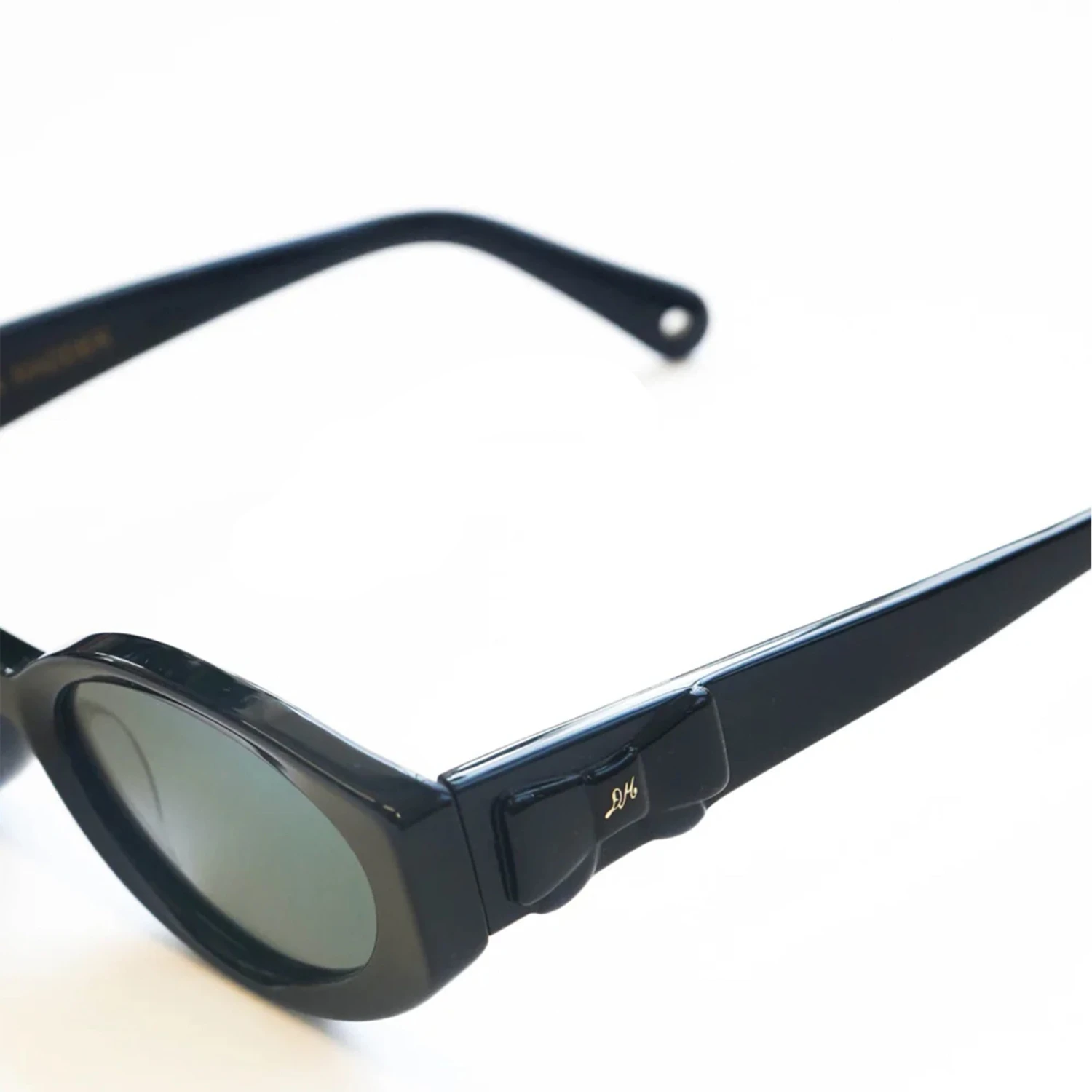 The Damson Madder Catty Oval Sunglasses in black feature a unique cateye-oval hybrid shape with smoke lenses and a charming bow detail on the temples. Made from recycled acetate, these sunglasses offer polarised lenses for enhanced clarity. Each pair comes with an eco-friendly cork case, recycled lining, and a cleaning cloth, combining style with sustainability.