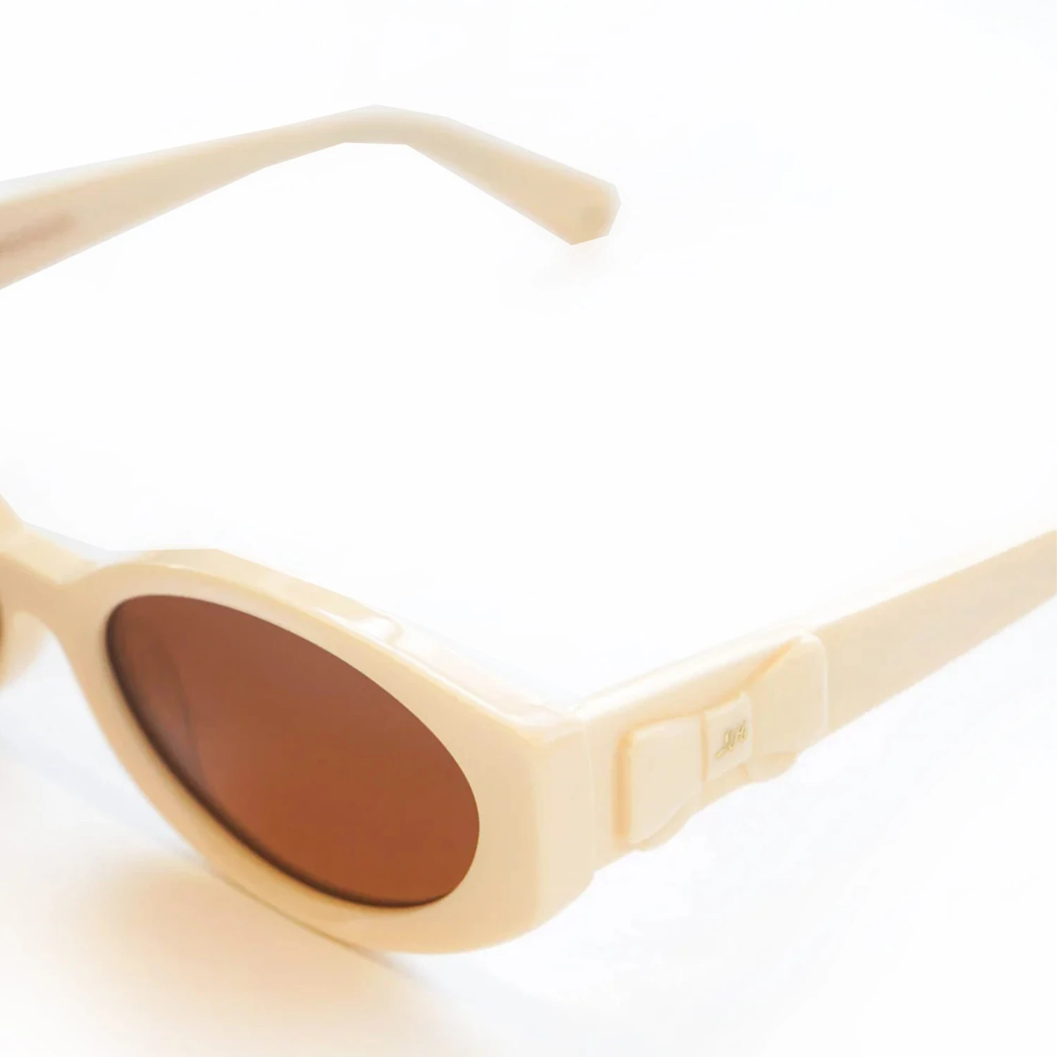 The Damson Madder Catty Oval Sunglasses in bone feature copper lenses and a bow detail on the temples, combining a cateye-oval hybrid shape with a touch of elegance. Made from recycled acetate, these sunglasses offer polarised lenses for enhanced protection and clarity. Each pair comes with an eco-friendly cork case, complete with recycled lining and a cleaning cloth, merging style with sustainability