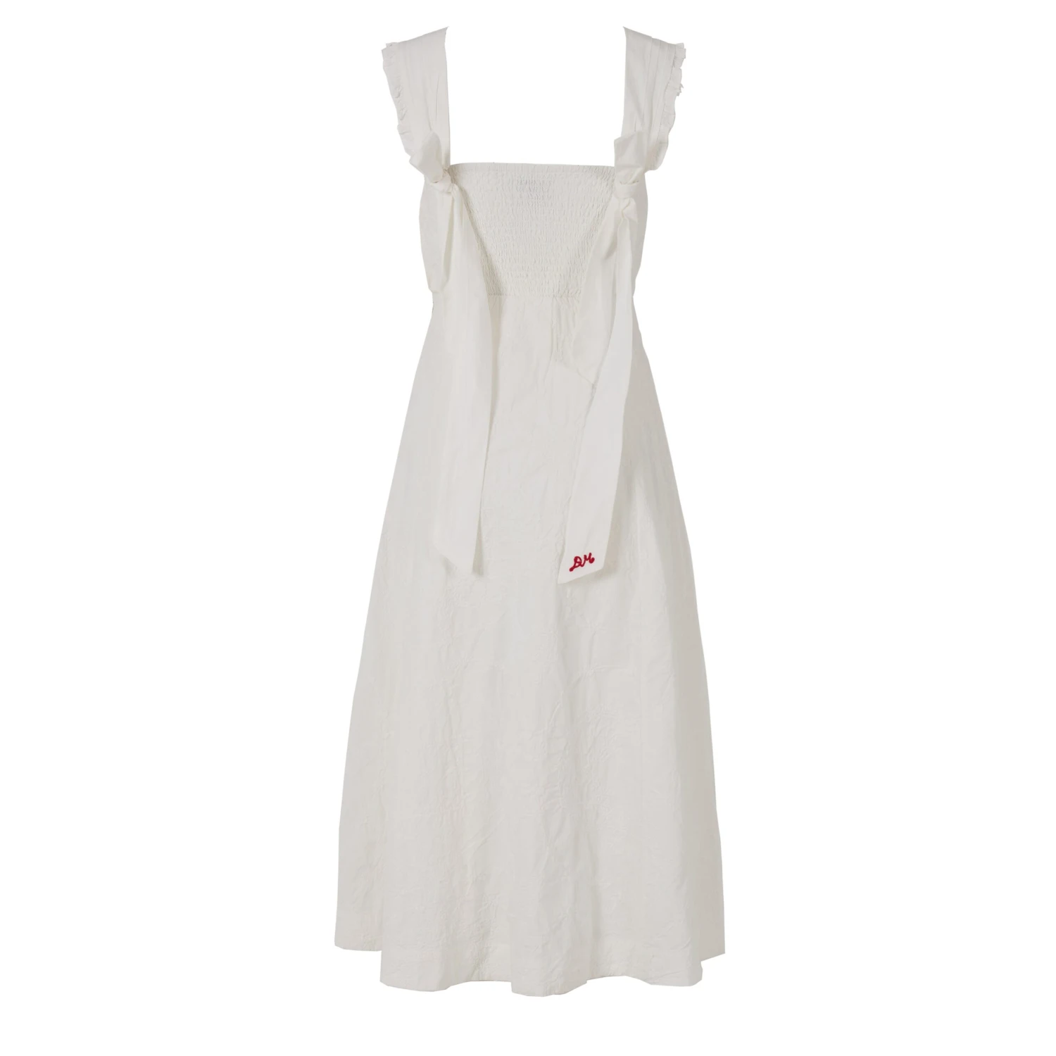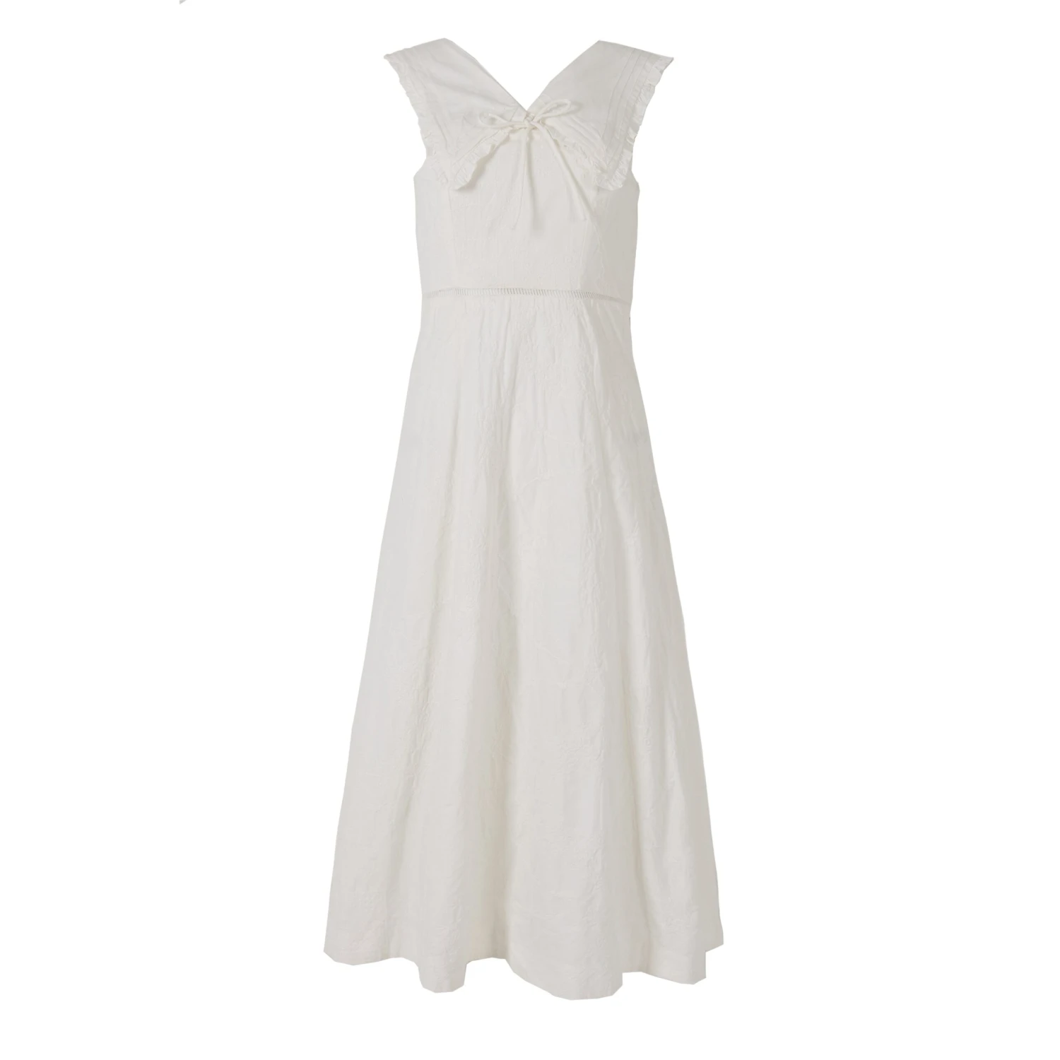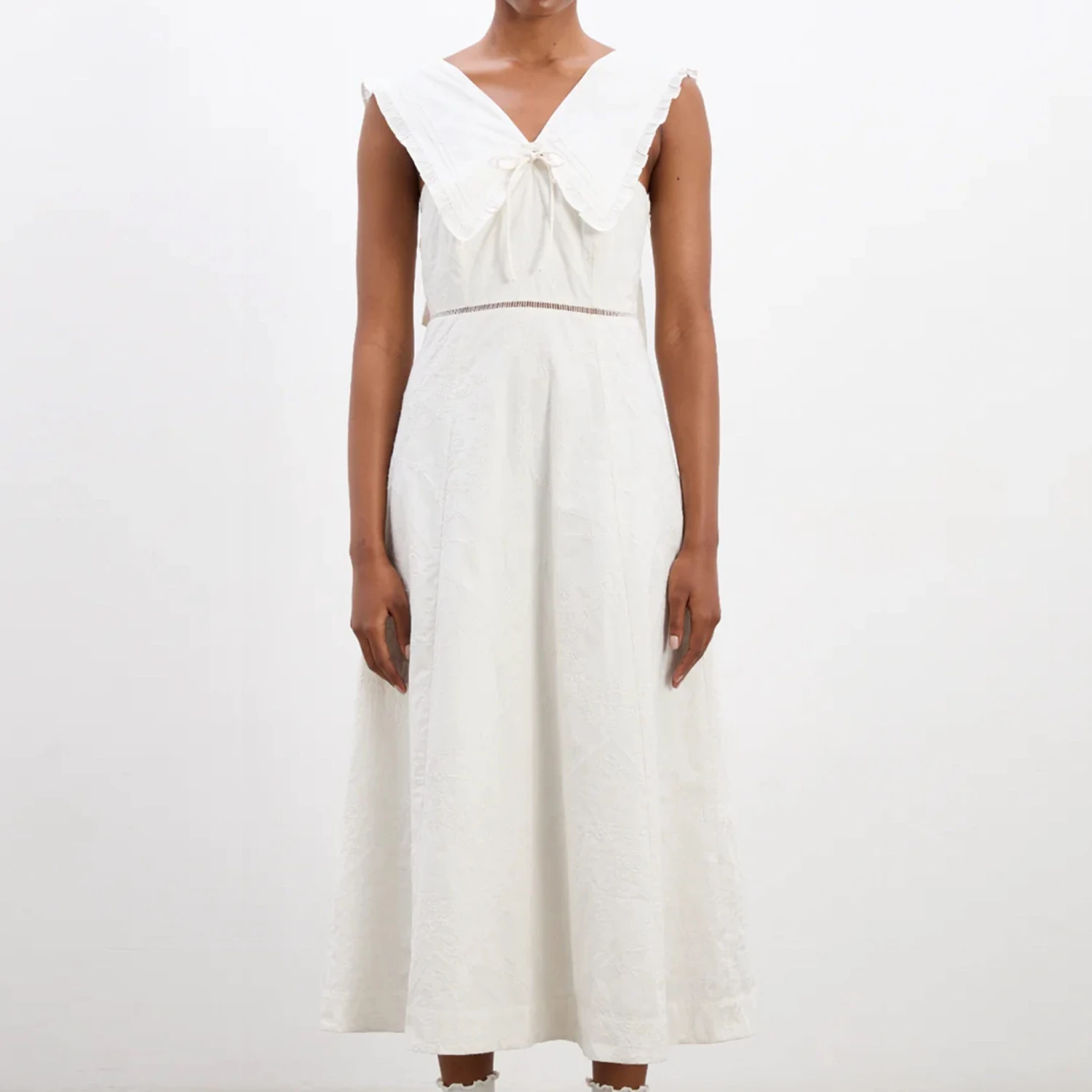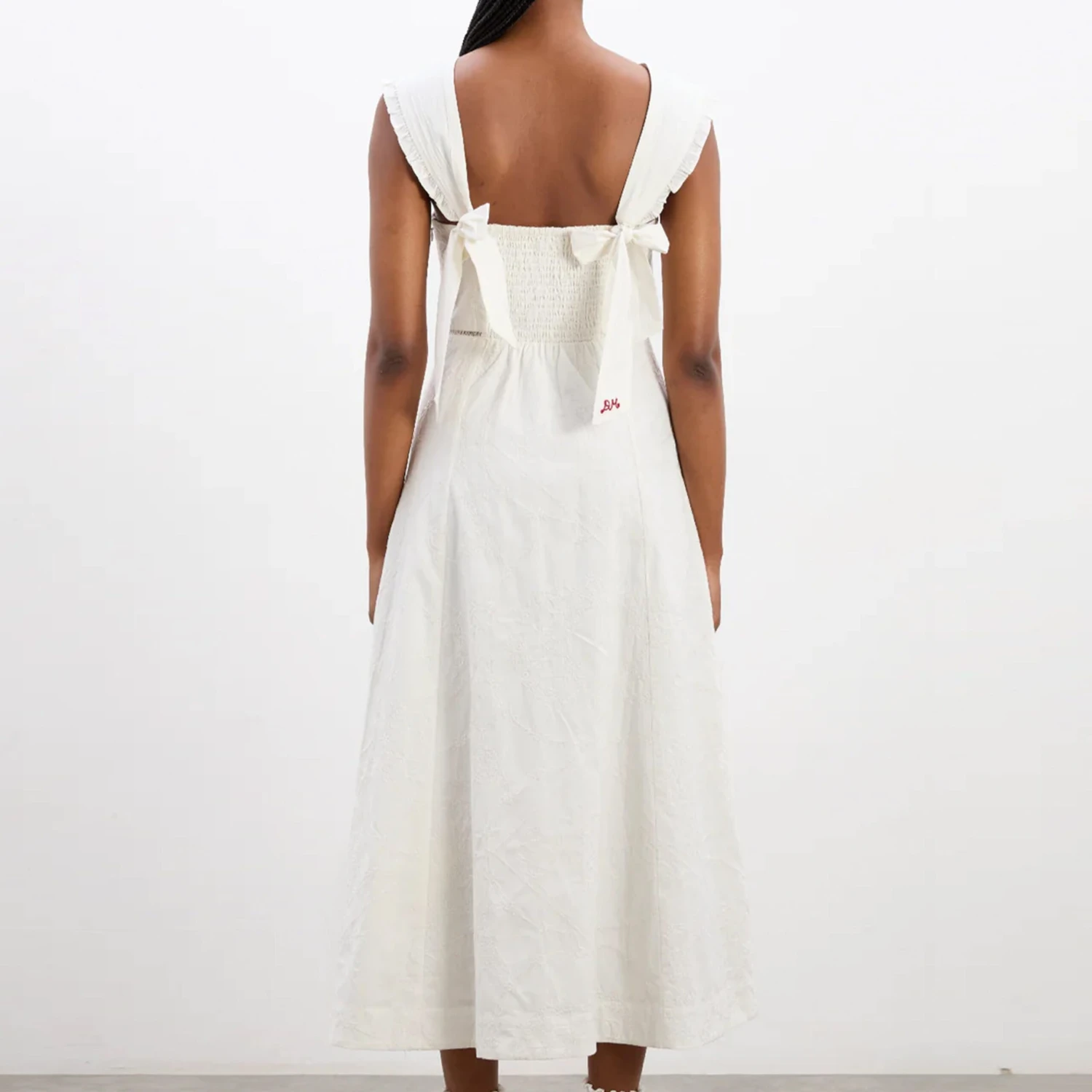 The Fan Fan Multi-Way Midi Dress in Damson Madder features an all-over embroidery design and a removable collar for a timeless, versatile look. Made from 100% organic cotton, this fitted dress can be styled as a bandeau strapless dress. Matching accessories are available to complete the ensemble.