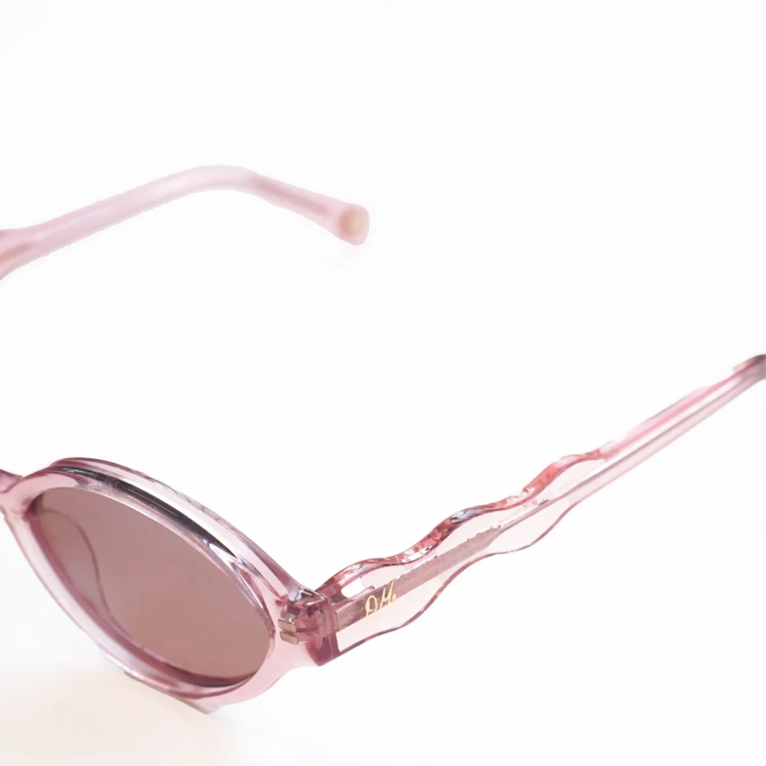 The Damson Madder Slim Oval Preppy Sunglasses in pink feature rose lenses and distinctive wavy arms with DM detailing on the temples. Crafted from recycled acetate, these sunglasses offer polarised lenses for optimal protection. Each pair comes with an eco-friendly cork case, lined with recycled material and includes a cleaning cloth, making it a stylish and sustainable choice.