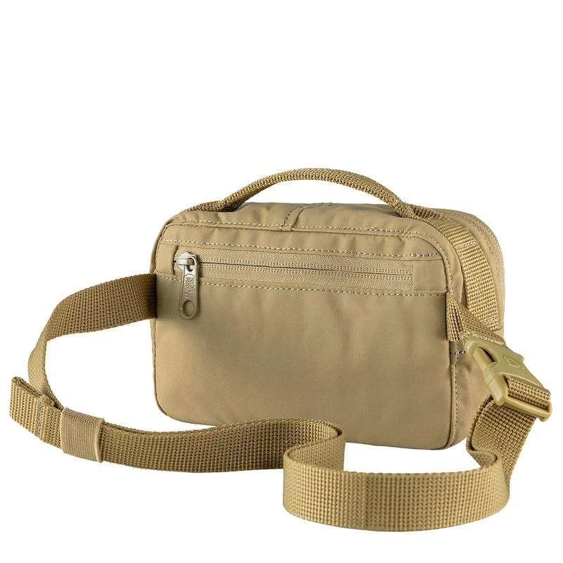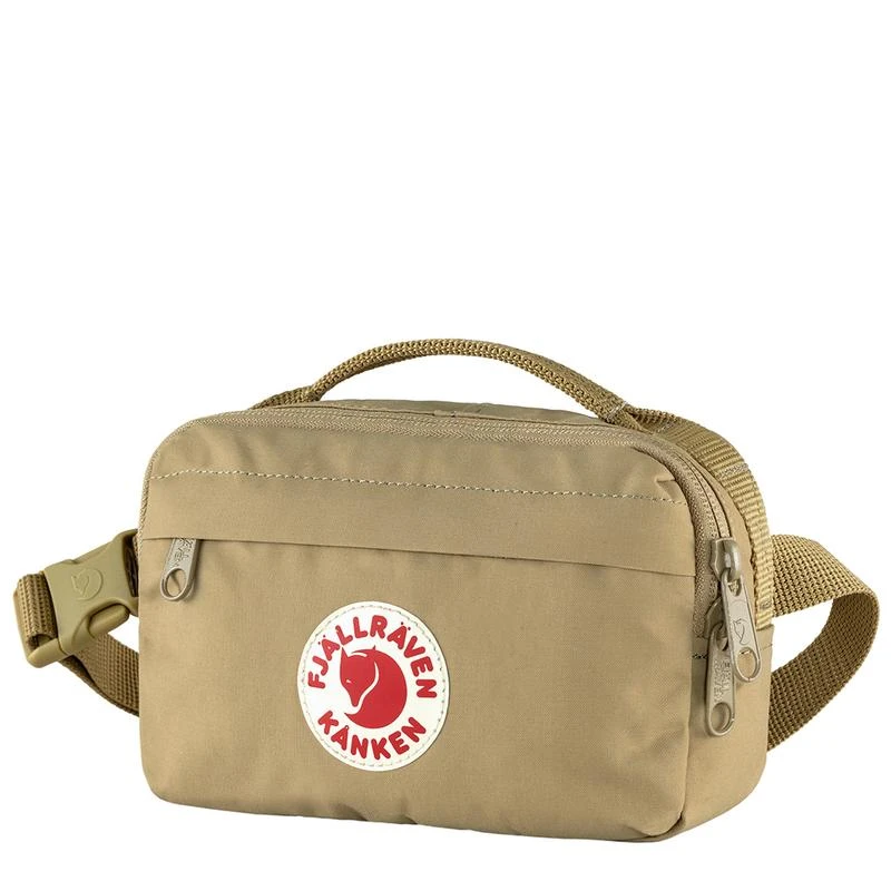 he Fjällräven Kånken Hip Pack in Clay is a compact and durable accessory perfect for storing your essentials on the go. Made from water-resistant Vinylon-F fabric, it features a main compartment and two separate zippered pockets to keep you organized. Wear it around your waist or over your shoulder for a stylish and functional look. Ideal for travel, festivals, or everyday use, this hip pack combines convenience with classic Kånken design.
