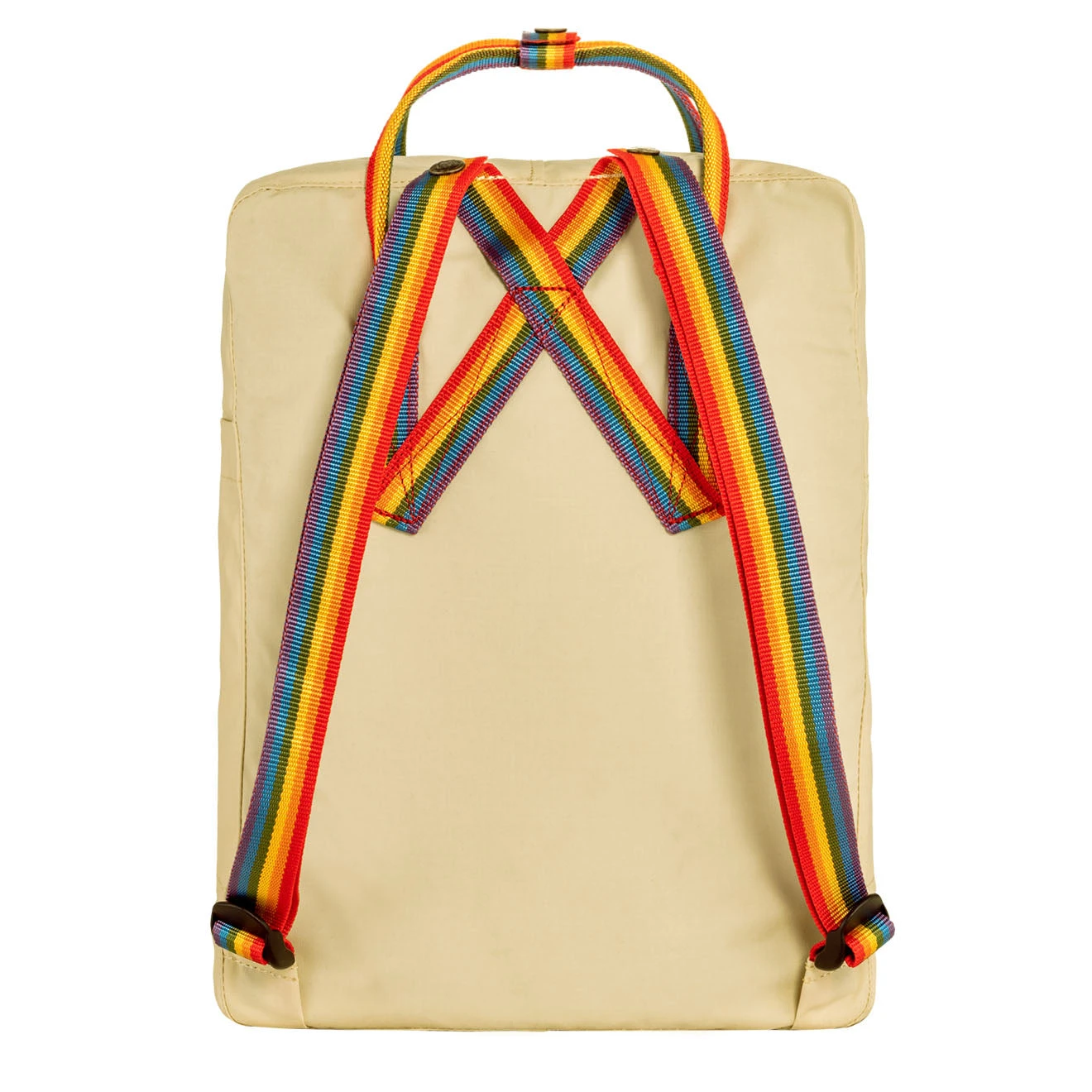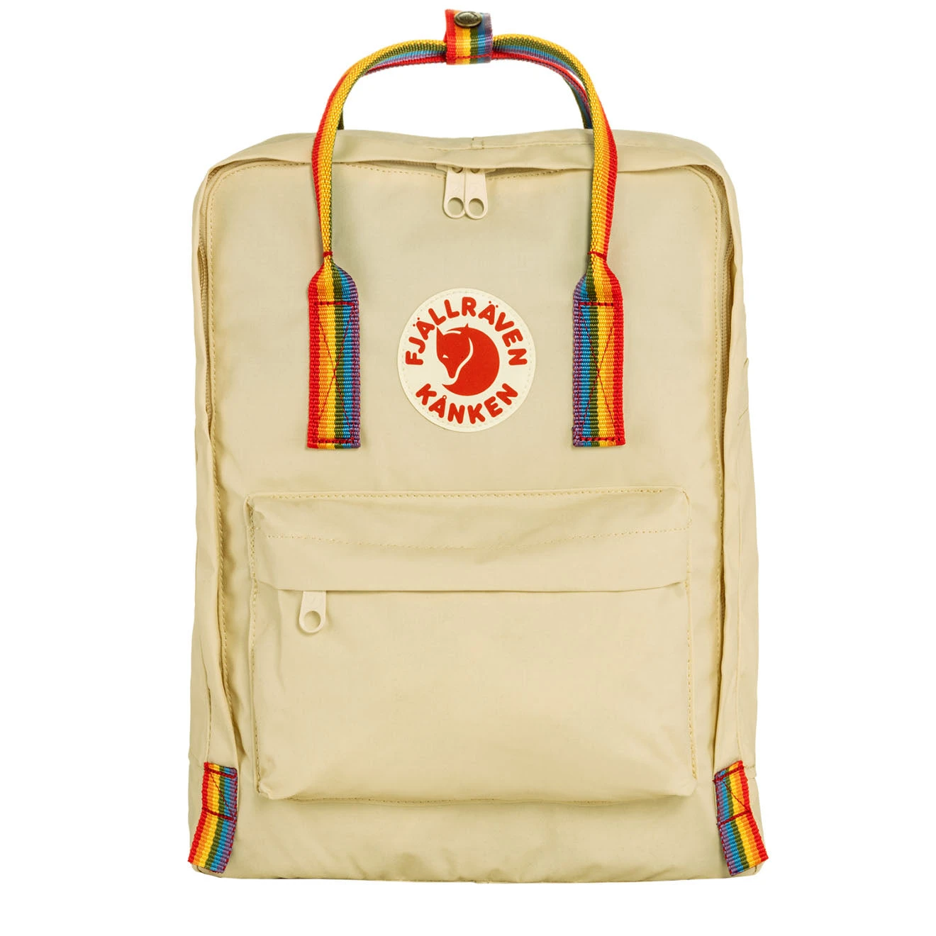 Fjallraven Kanken Rainbow Classic Backpack Light Oak / Rainbow Pattern is crafted from durable, water-resistant Vinylon F fabric, designed to withstand everyday wear. It features a large zippered main compartment that opens fully for easy access, along with a small front pocket, two side sleeves, and simple adjustable shoulder straps. A removable seat pad adds extra comfort on the go, and the vibrant rainbow details celebrate inclusivity. Built without PFCs, it’s made for long-lasting, sustainable use.