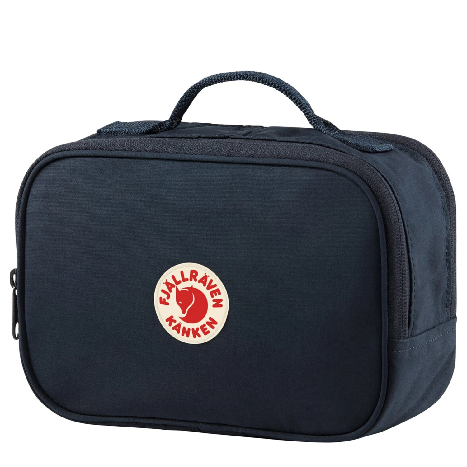 The Fjallraven Kanken Toiletry Bag in Navy is a practical and durable travel companion made from G1000 Heavy Duty Eco fabric with a PU coating for excellent resistance to wear and tear. Designed with two zippered main compartments and a variety of internal mesh, zip and open pockets, it helps keep your essentials organised while on the move. A sturdy canvas carry handle and the signature Arctic Fox logo on the front complete this functional and stylish toiletry bag, ideal for travel and everyday use.