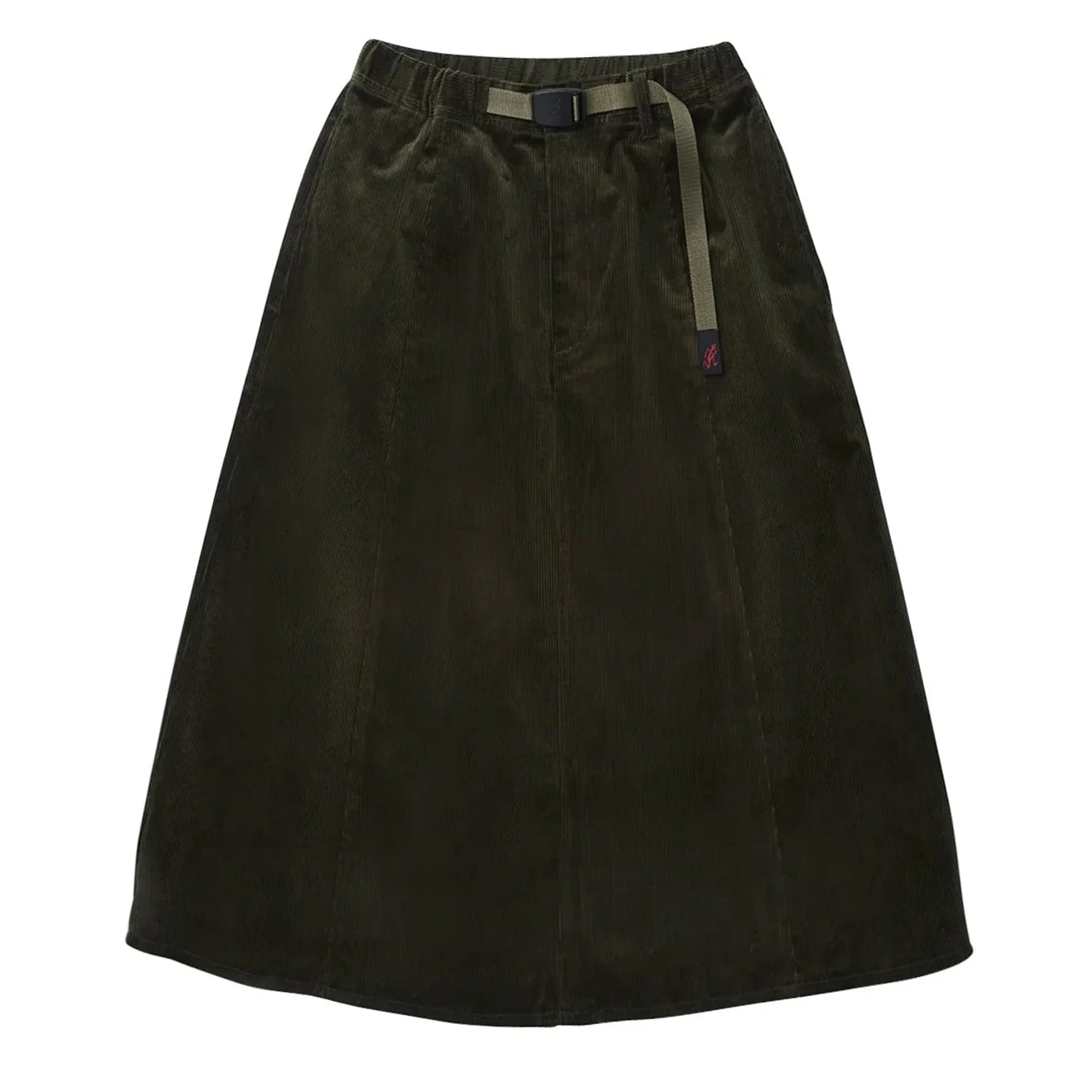 The Gramicci Womens Paneled Midi Skirt Olive Green is a mid-length, below-the-knee flared skirt made from stretch corduroy cotton. Features a nine-panel design with a classic drape and integrated belt for easy adjustability.