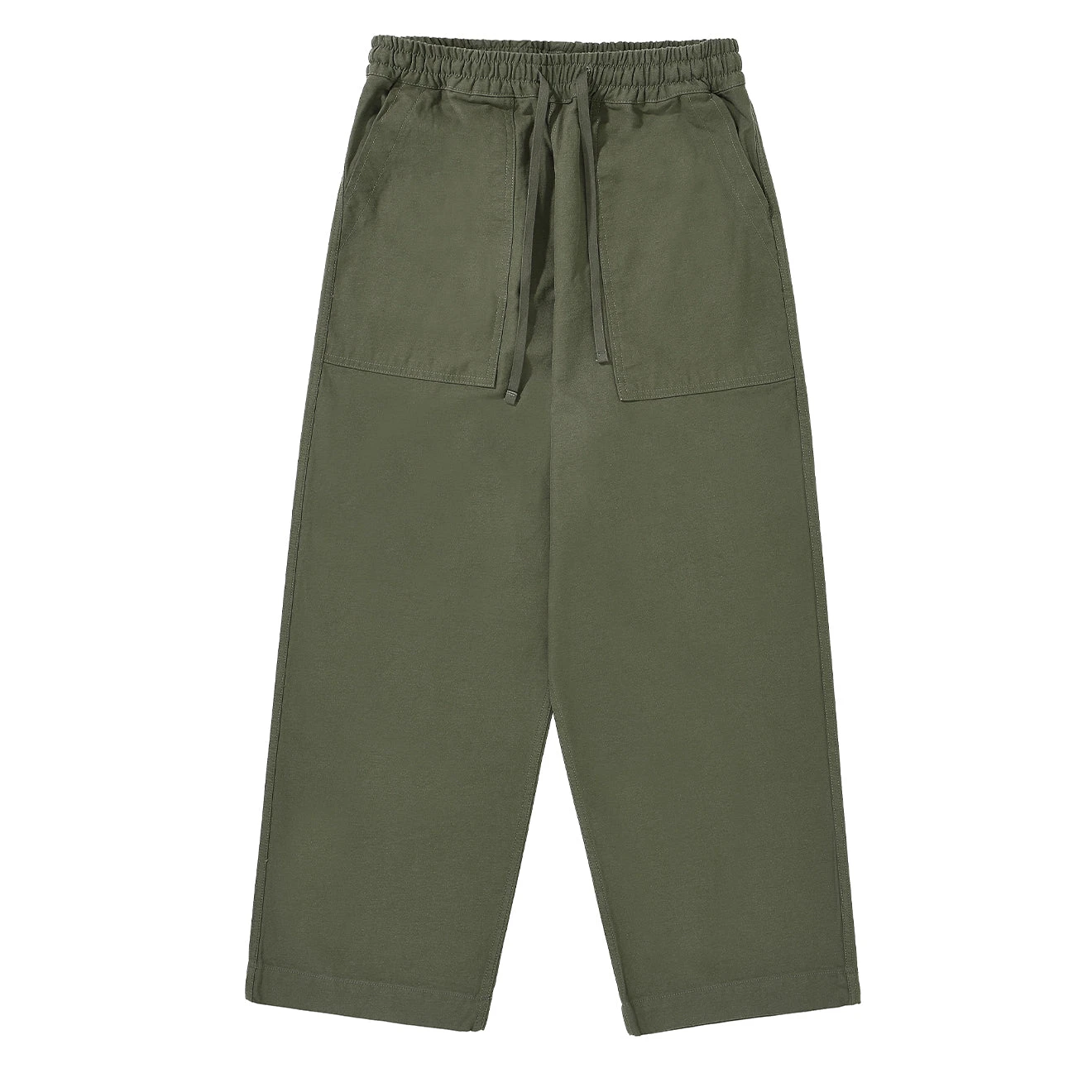The Kappy Heavy Cotton Fatigue Pants in Khaki are made from thick, durable cotton material, featuring high-density twill fabric that offers a soft and warm touch for comfort. The waist banding and adjustable strings ensure a comfortable fit for all body types. These pants undergo washing after production to minimize fabric shrinkage. The relaxed silhouette allows for versatile styling with various tops.