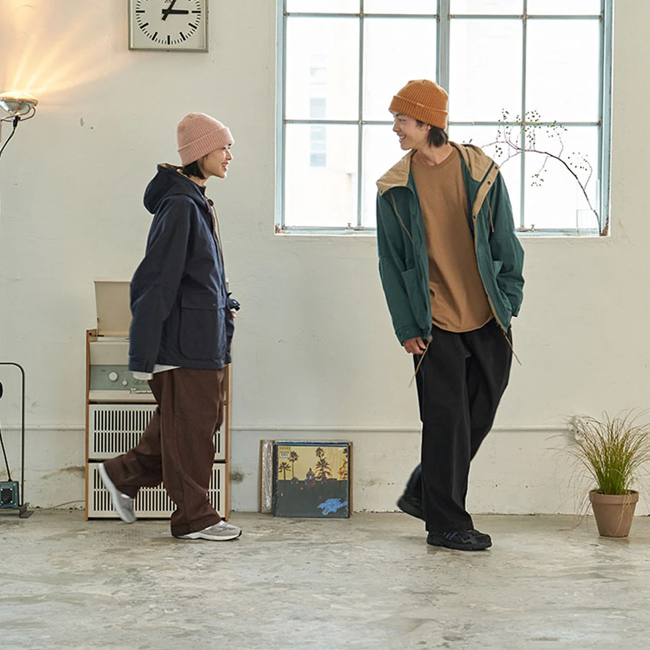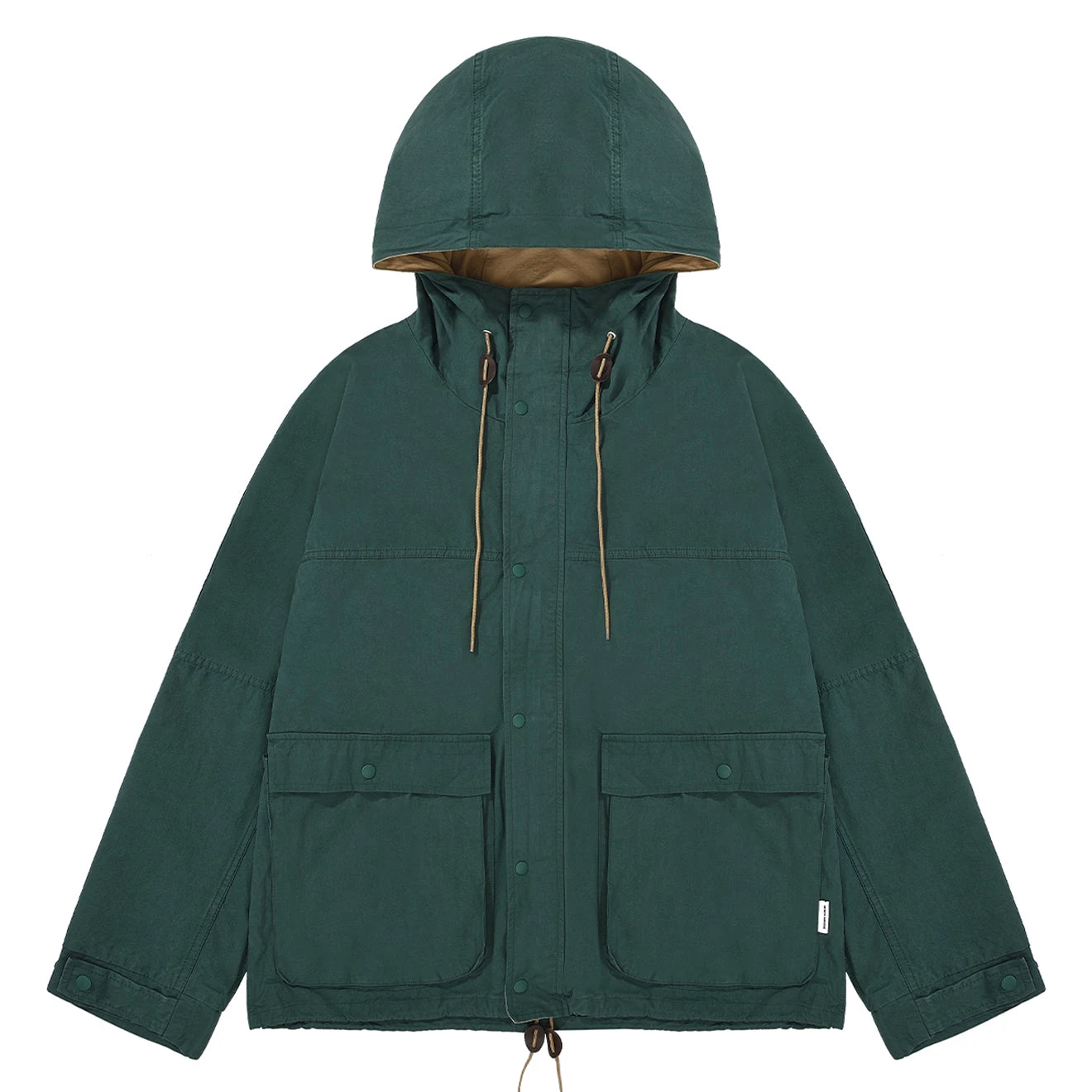 The Kappy Mountain Jacket in Forest features a comfortable, natural silhouette with a moderate overfit. Made from 100% cotton fabric, it offers durability and a solid thickness. The color contrast between the outer fabric and the hood lining serves as a focal point, enhanced by vintage-inspired leather stoppers. Built-in strings on the hood and hem allow for size and fit adjustments, while snap summarys provide customizable sleeve circumference. The lower pockets are designed for practicality, accessible from both the top and side.