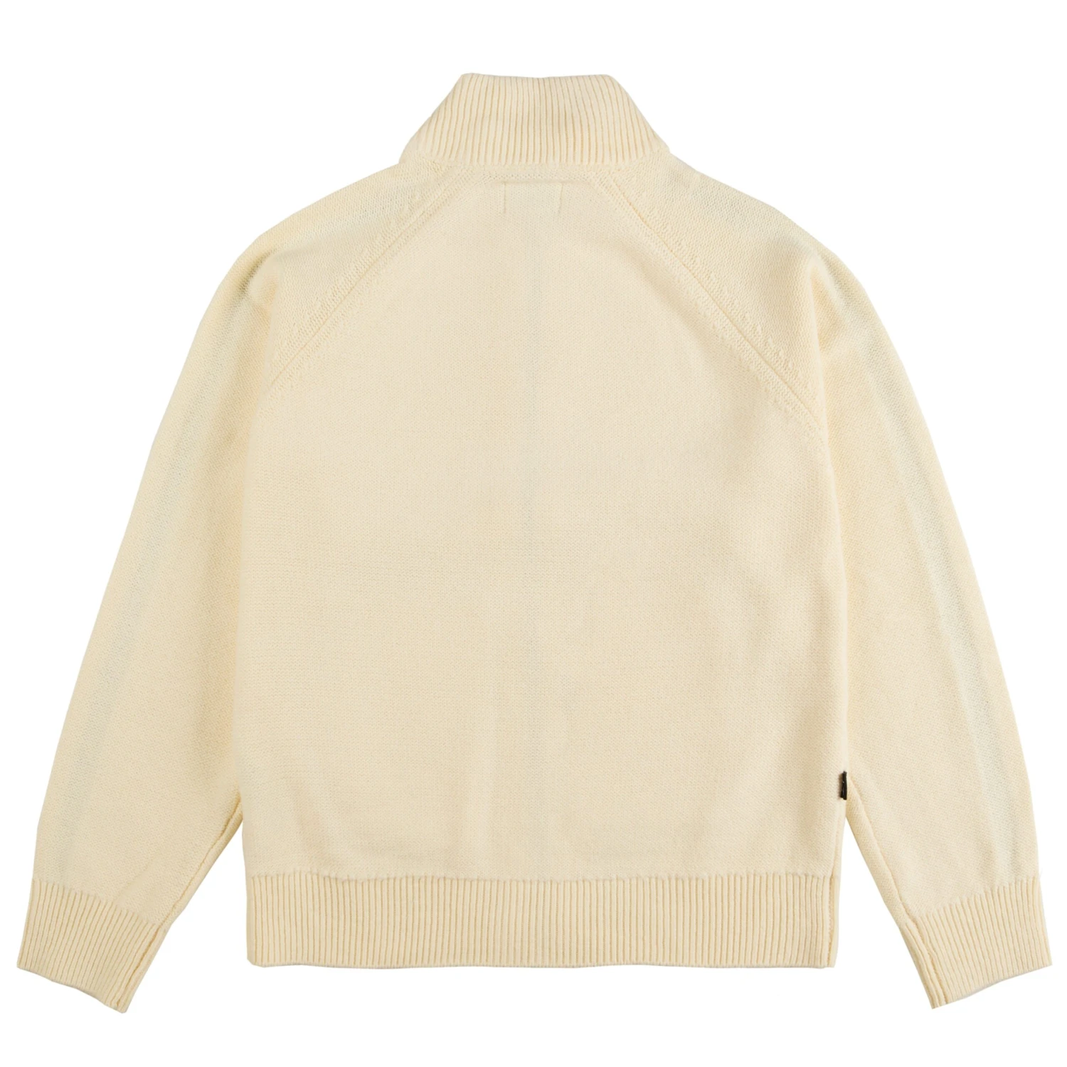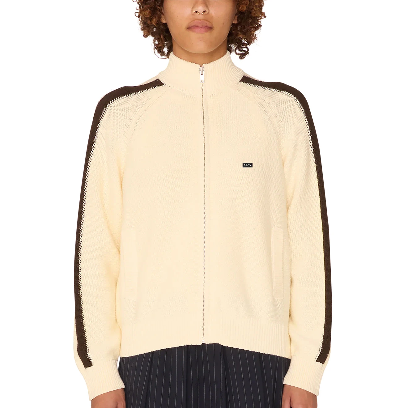 The Obey Women’s Frankie Track Sweater in Dove combines comfort and style with its raised jacquard texture and sleeve stripe detail. Featuring a full zipper closure, ribbed collar, neck, hem, and sleeves, this relaxed-fit sweater is made from 100% cotton for a soft feel. A small patch label adds a subtle branded touch, making it the perfect casual addition to any wardrobe.