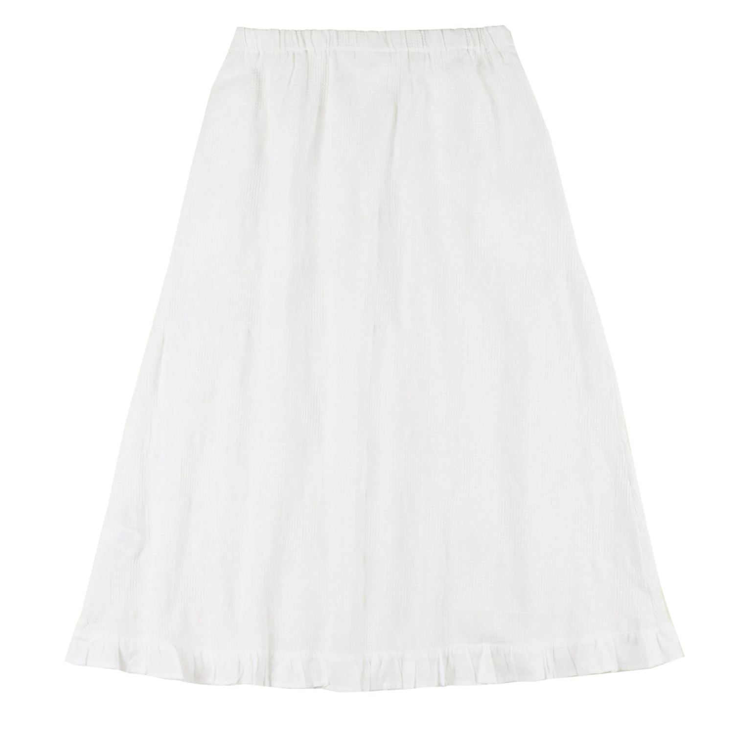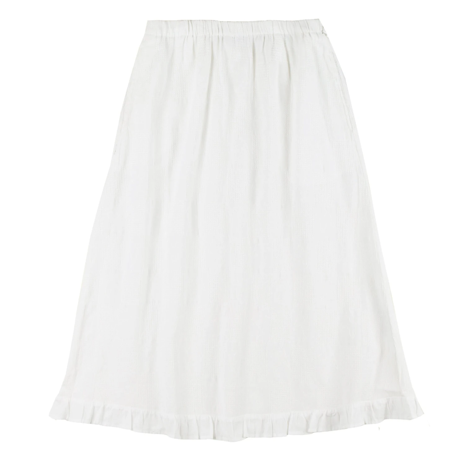 The Obey Women’s Manor Jacquard Skirt in White features an intarsia jacquard design with a playful ruffle trim. It has a comfortable elastic waist, on-seam front pockets, and an OBEY label on the right side seam. Made from a soft cotton-poly blend and Fair Trade certified, this 29″ outseam skirt offers a regular fit that’s both stylish and easy to wear.