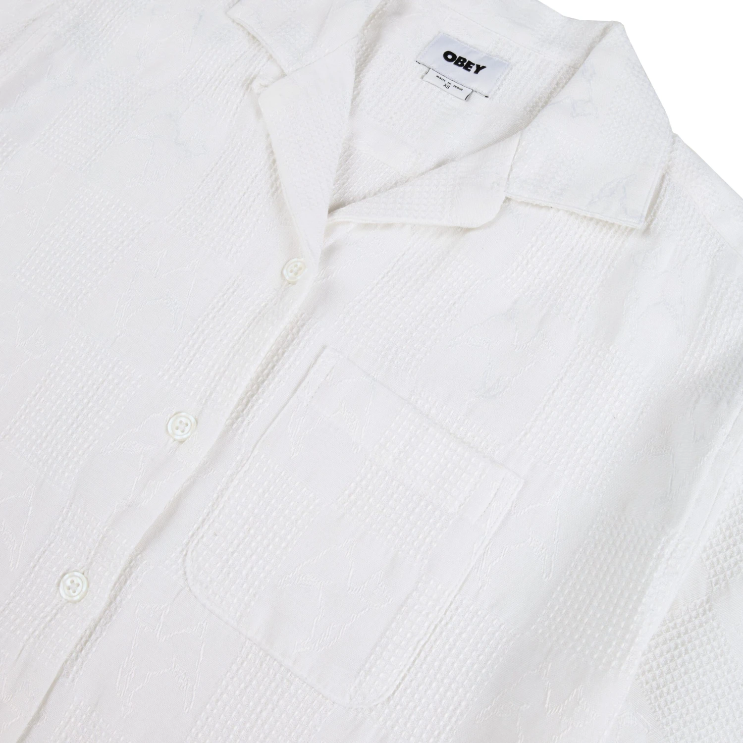 The Obey Womenβs Manor Jacquard Shirt in White is a relaxed-fit, cropped short sleeve shirt featuring an all-over jacquard pattern. Made from a soft cotton-polyester blend, it includes a summary front, chest pocket, straight hem, and side flag label. Crafted under Fair Trade standards, it combines comfort with standout texture and subtle branding.