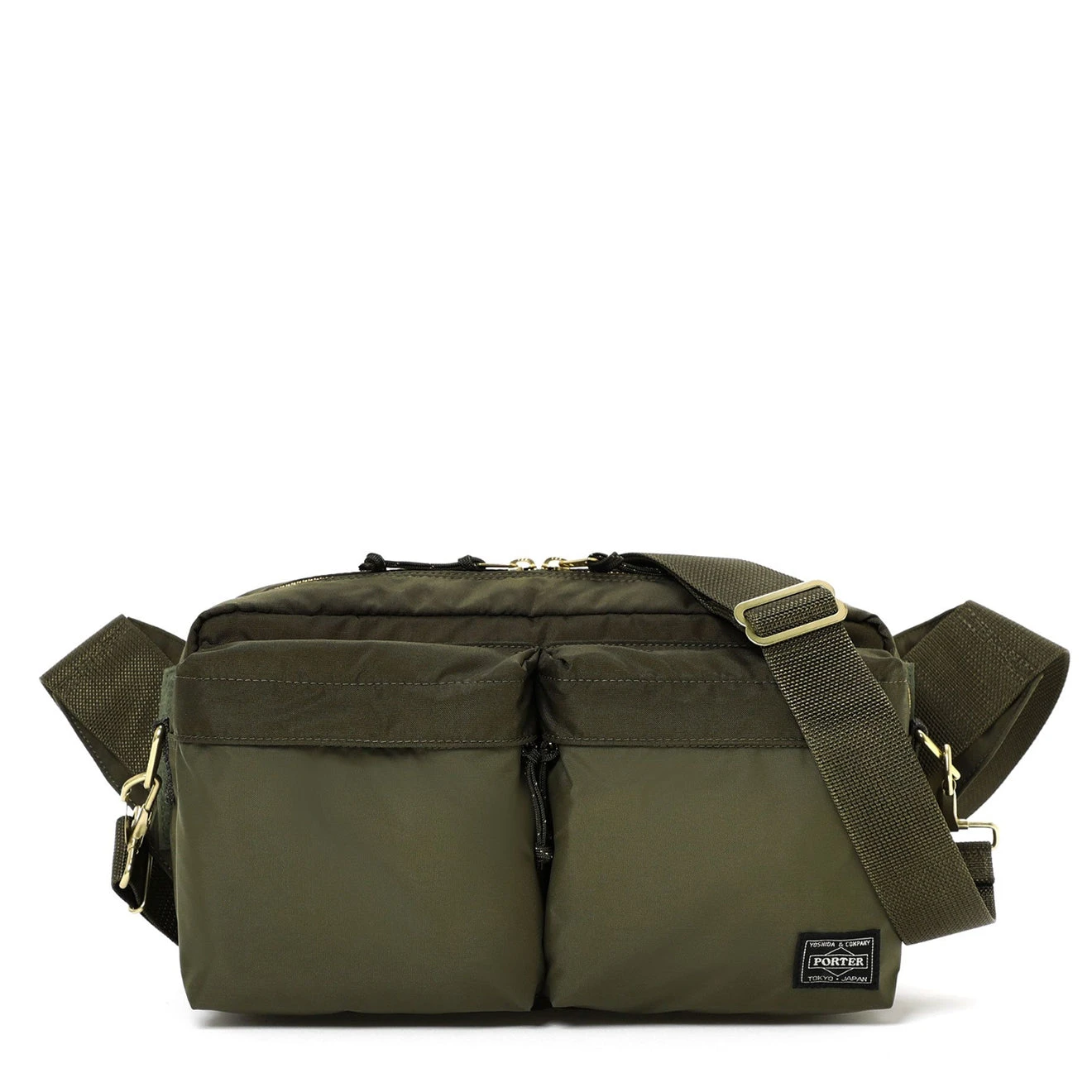 The Porter-Yoshida & Co Force 2 Way Waist Bag in Olive Drab is part of the military-inspired Force Series, utilizing industrial-grade 210-denier nylon in Japan for exceptional strength and durability. This hardwearing material is designed to withstand daily use. The bag features an adjustable shoulder strap, two exterior pockets, and a spacious interior with internal pouches, offering a perfect blend of practicality and rugged style for any adventure.