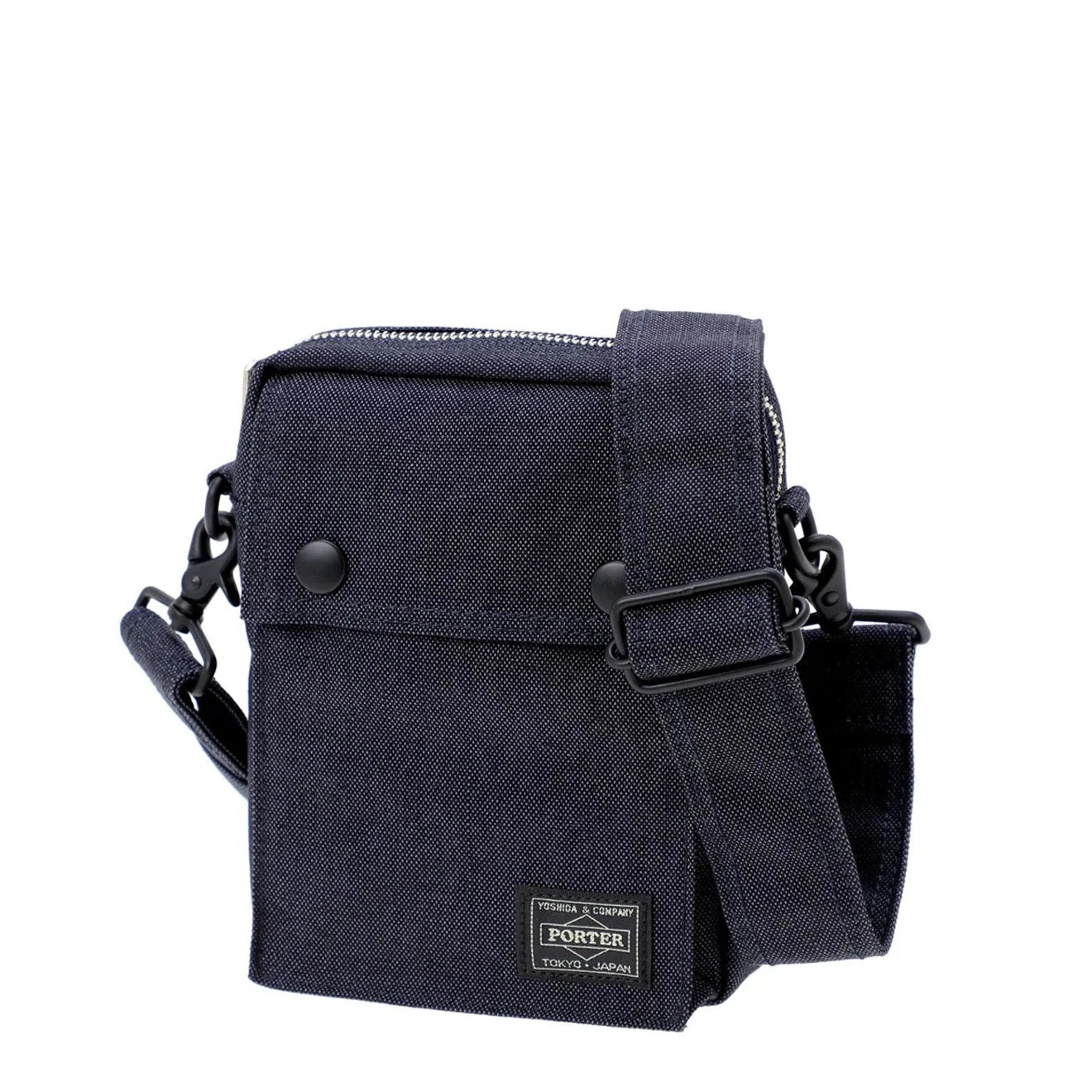 the porter-yoshida and co smoky vertical shoulder bag in navy is perfectly sized for essentials such as a wallet and smartphone. it features interior pockets, a front pocket, and a back pocket for easy organization and access. ideal for both everyday use and travel, it showcases “cordura duck” fabric – a blend of zimbabwean cotton and 1000 denier cordura – offering a unique texture with the softness of cotton and the durability of nylon.