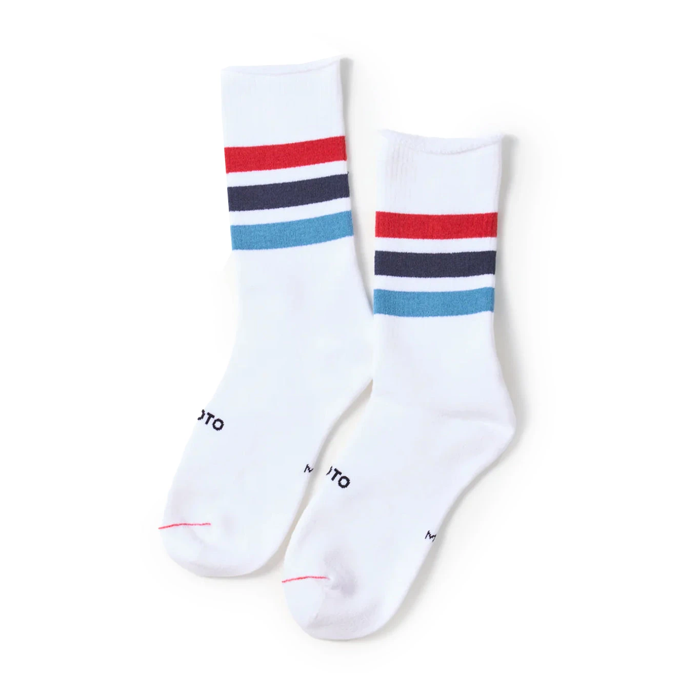 The design of these stripy socks is inspired by tube socks. Knitted with organic cotton yarn with a fine high-gauge knitting machine, the fabric feels smooth and comfortable with adequate thickness and entirely piled lining. The color combinations are sampled from hip-hop record jackets designed in the 1990s. The vivid stripes provide a great accent to your look.