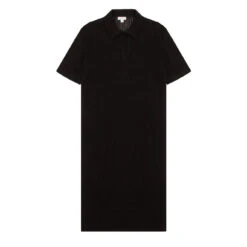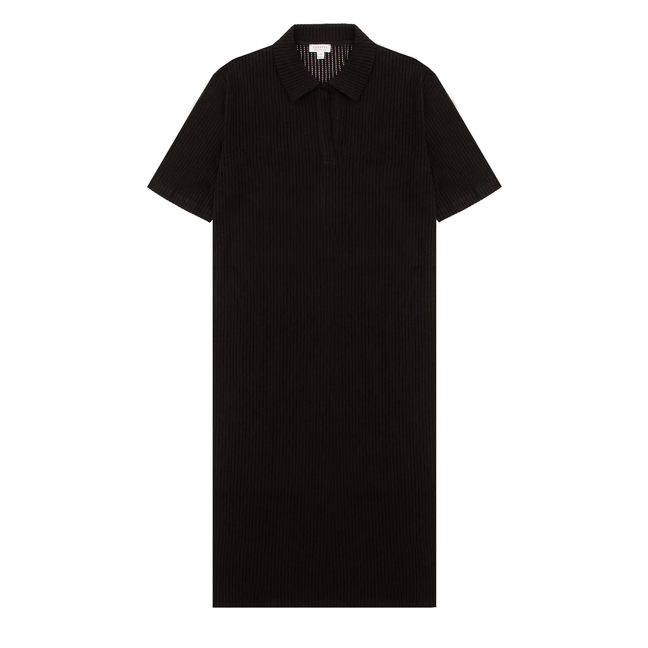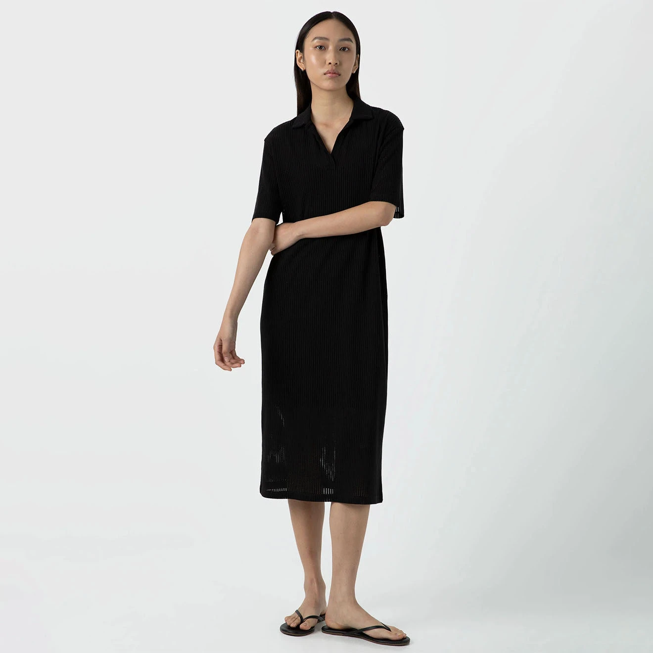 Sunspel Womens Lace Mesh Polo Dress in Black. Crafted from the softest Californian Supima cotton, this jersey dress has an easy textured mesh inspired by Sunspel’s Nottingham heritage in lace making.