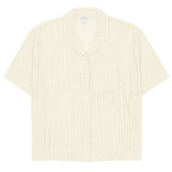 The is Sunspel Womens Lace Mesh Shirt in Ecru is crafted from the softest Californian Supima cotton in an easy textured mesh inspired by our Nottingham heritage in lace making. Slightly cropped with a boxy cut and camp collar neck, it is a perfect, cool high summer piece.
