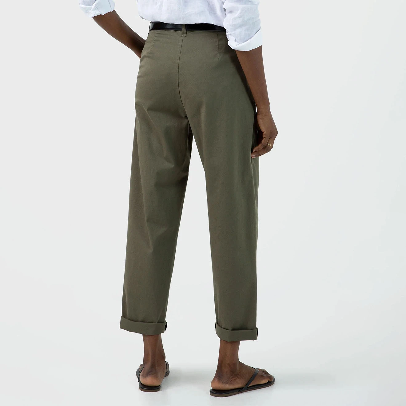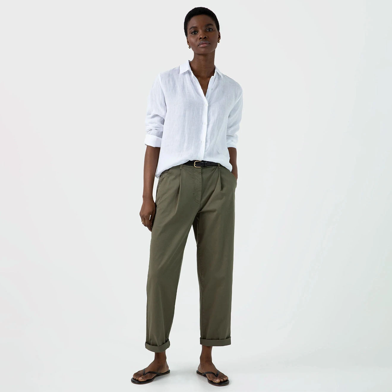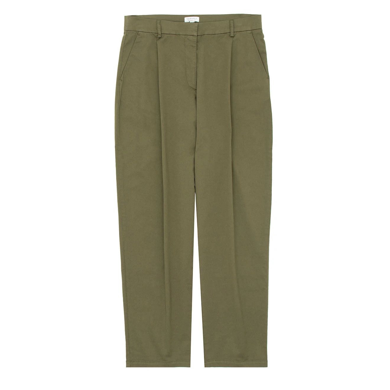 The Sunspel Womens Pleated Chino in Pale Khaki is a comfortable chino with a relaxed tapered fit crafted in a soft, light cotton twill with a slight stretch for added comfort. Versatile, effortless and perfect for everyday summer wear. Pair with a T-shirt, rib vest or white shirt.