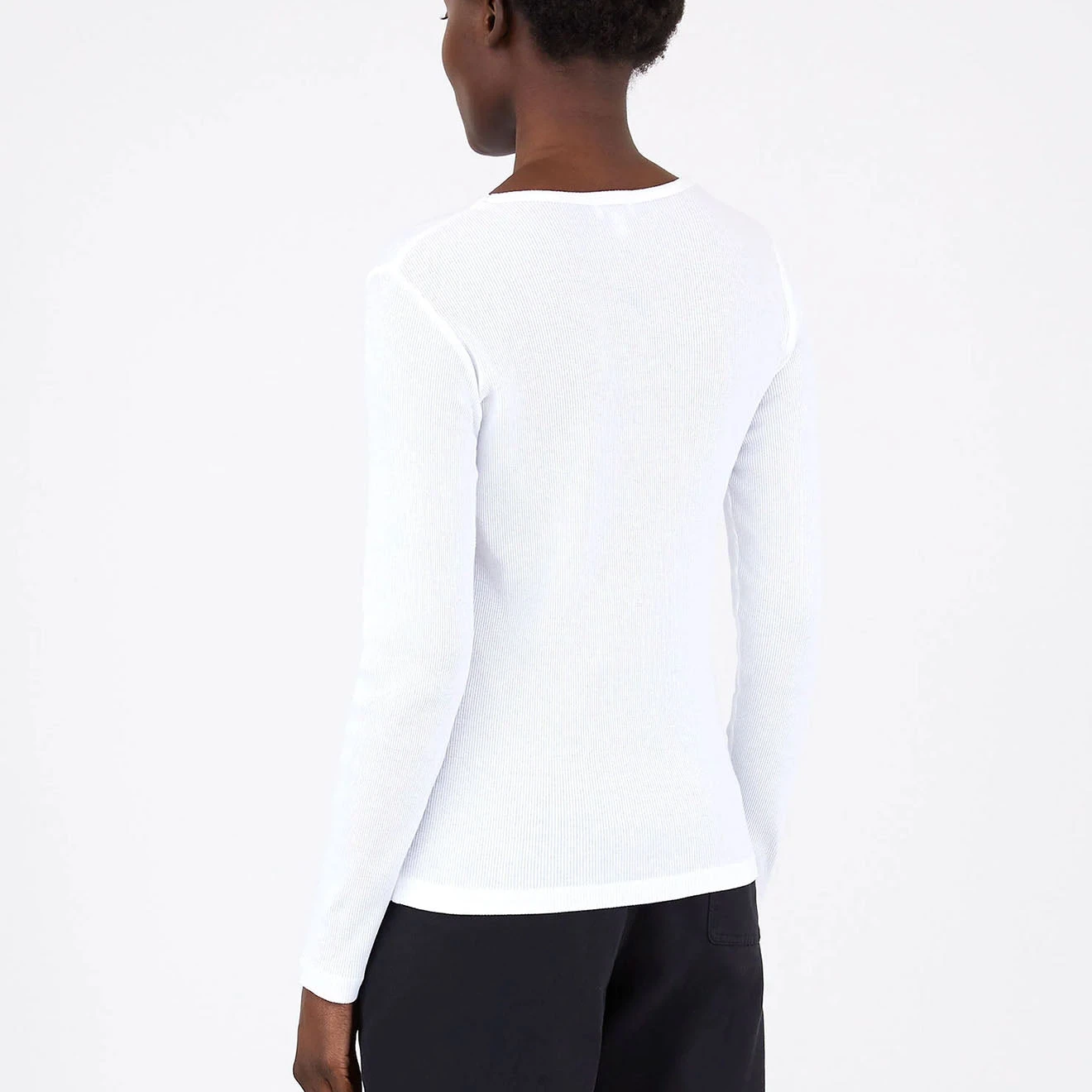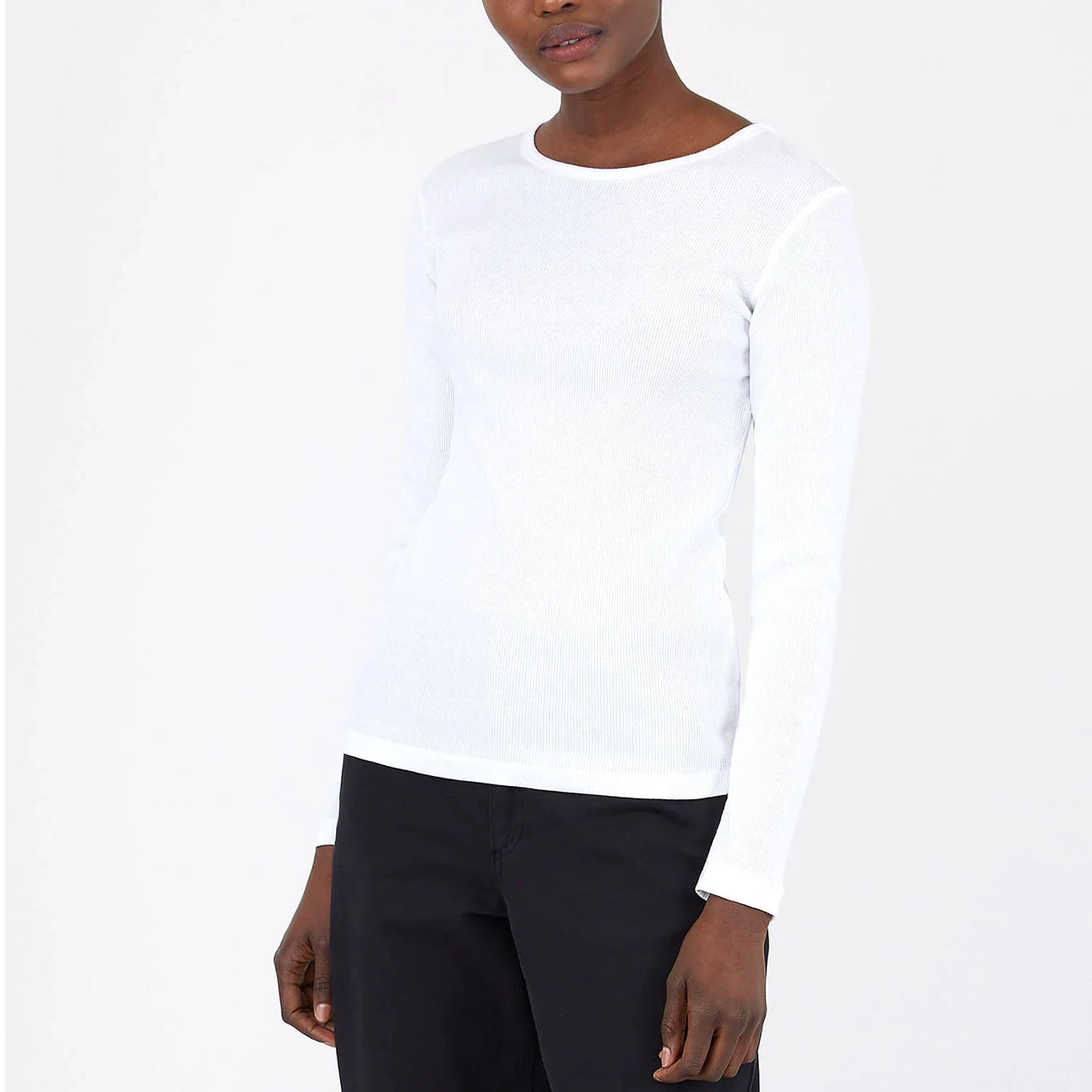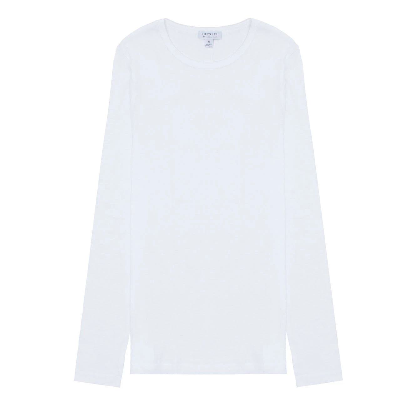 The Sunspel Womens Ribbed Long Sleeve T-Shirt in White is a fine rib T-shirt, a classic style you’ll wear for years to come. Crafted from a very soft organic cotton rib, this regular-fitting piece layers well or can be worn alone tucked into trousers or skirts. The perfect trans-seasonal T-shirt.