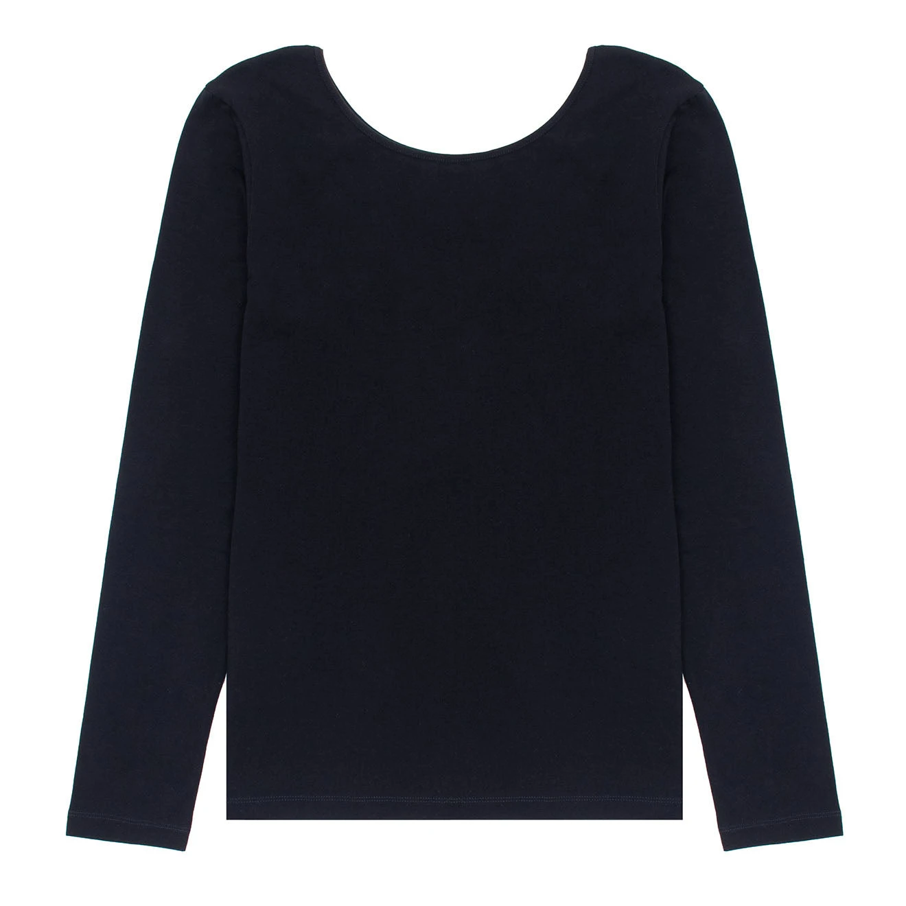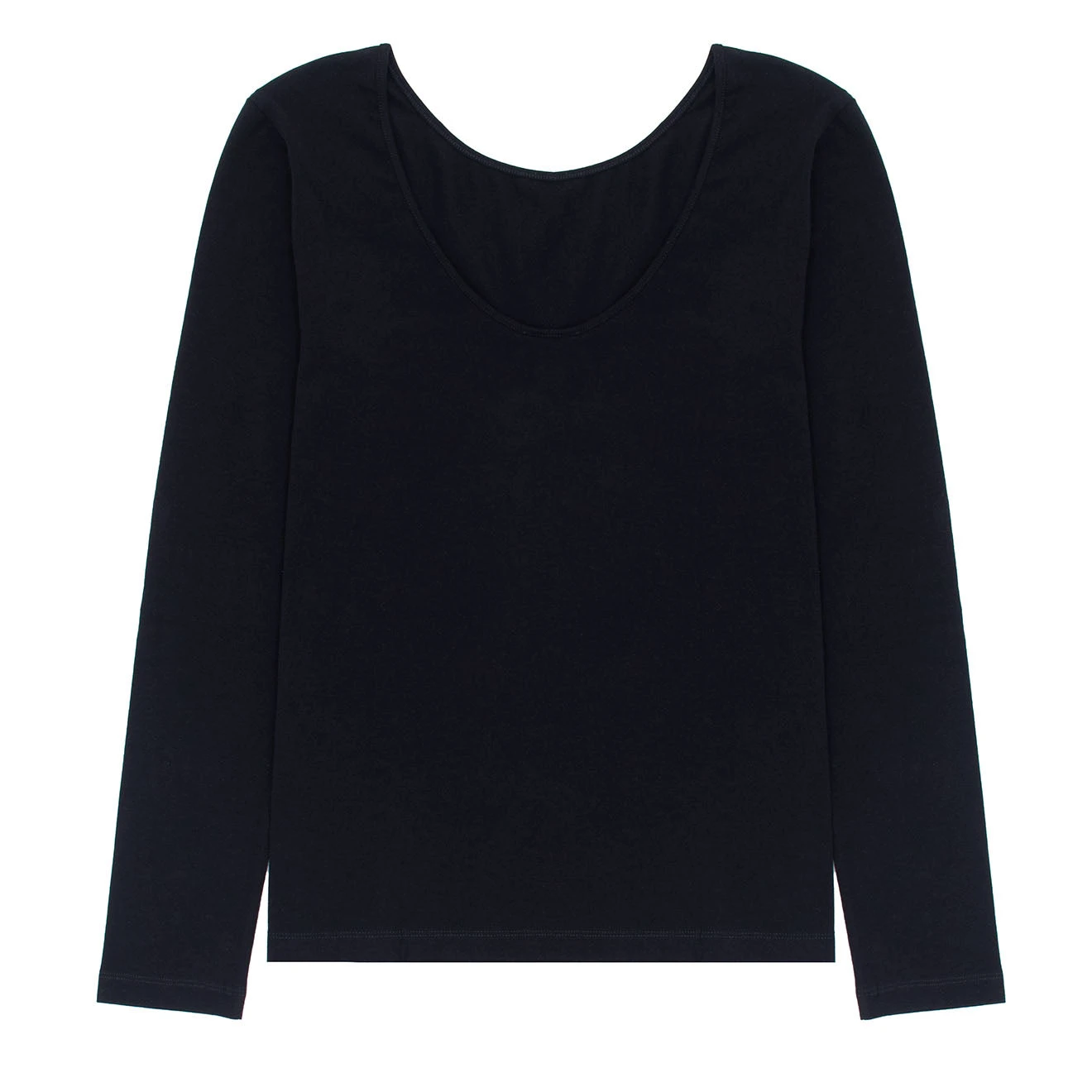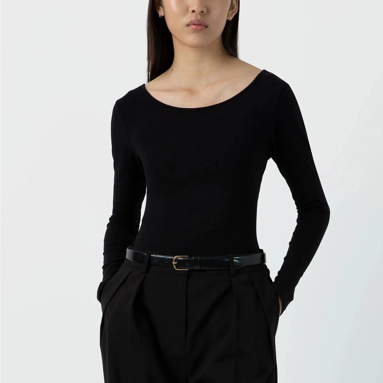 The Sunspel Womens Scoop Back Top in Black is crafted from a beautifully soft cotton jersey with a slight stretch for added comfort, this top has a feminine, body-hugging silhouette and an elegant scoop back neckline. An effortless standalone layer that can also be layered under a shirt or cardigan.