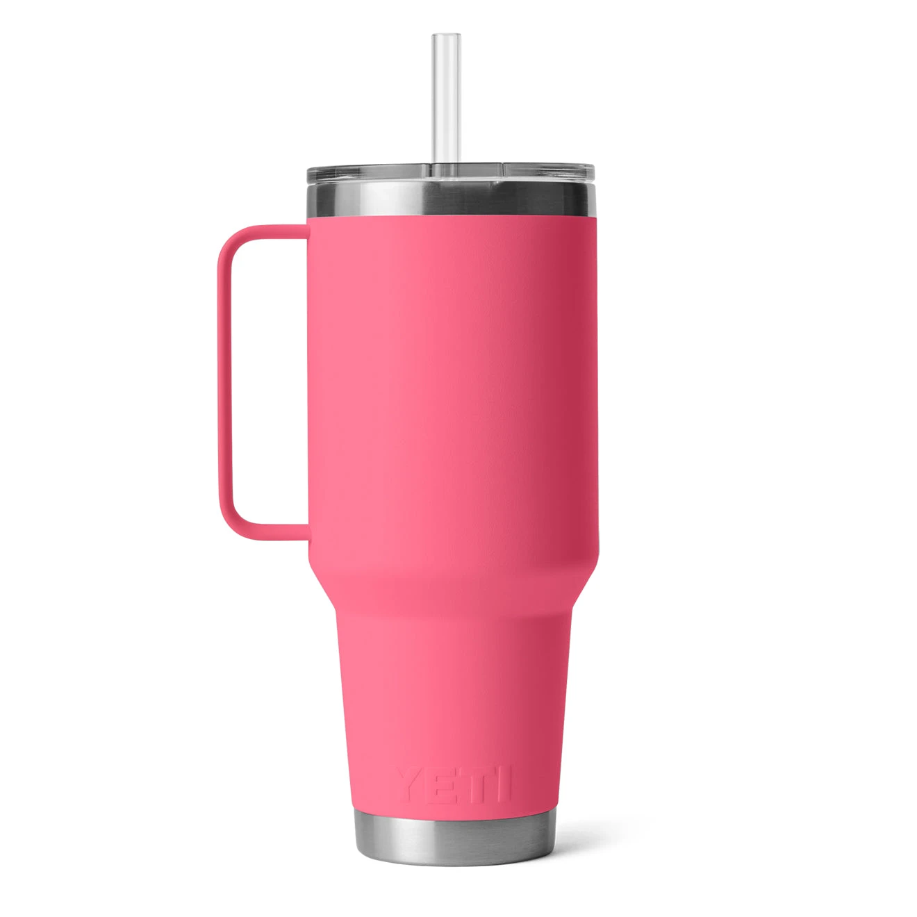 The YETI Rambler 42oz Straw Mug in Tropical Pink uses insulation technology to maintain cooler drinks while minimizing plastic waste. Its large capacity, coupled with a handle and cup-holder-compatible design, makes it perfect for extended outdoor excursions.
